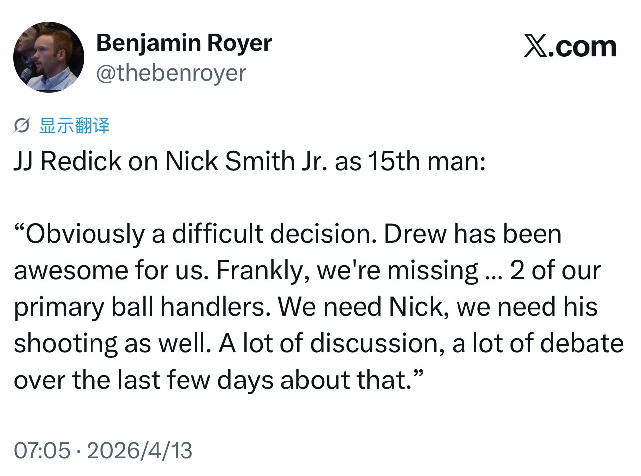 雷迪克谈签约小尼克·史密斯:“这显然是个艰难的决定。德鲁·蒂米这段时间为我们打得