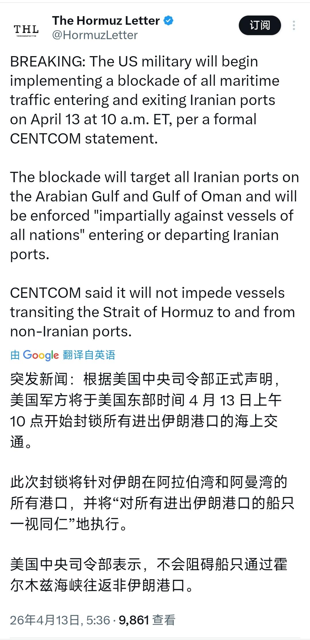 突发新闻:根据美国中央司令部正式声明,美国军方将于美国东部时间4月13日上午10点开始封锁所有进出伊朗港口的海上交通。
