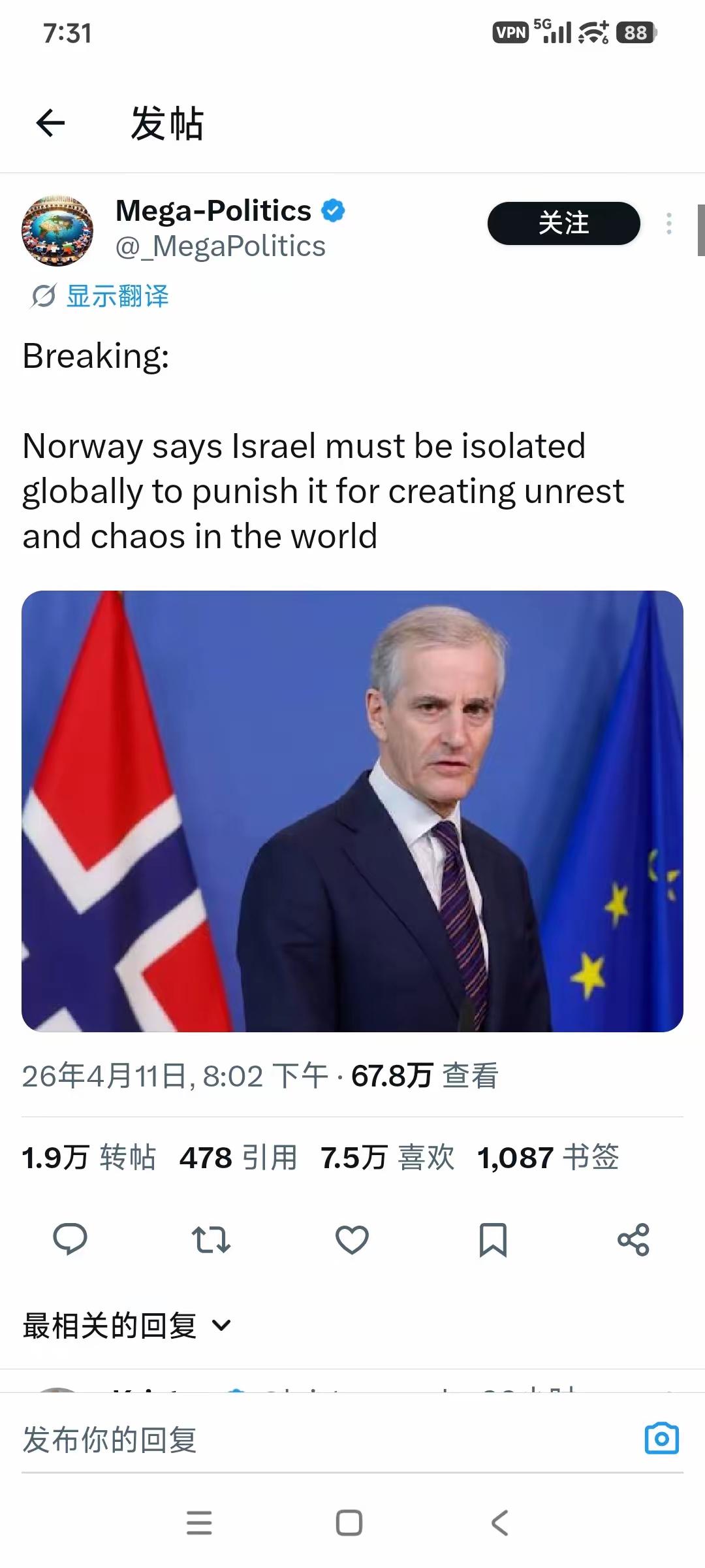 突发新闻:挪威表示,必须在全球范围内孤立以色列,以惩罚其在世界制造动荡和混乱。