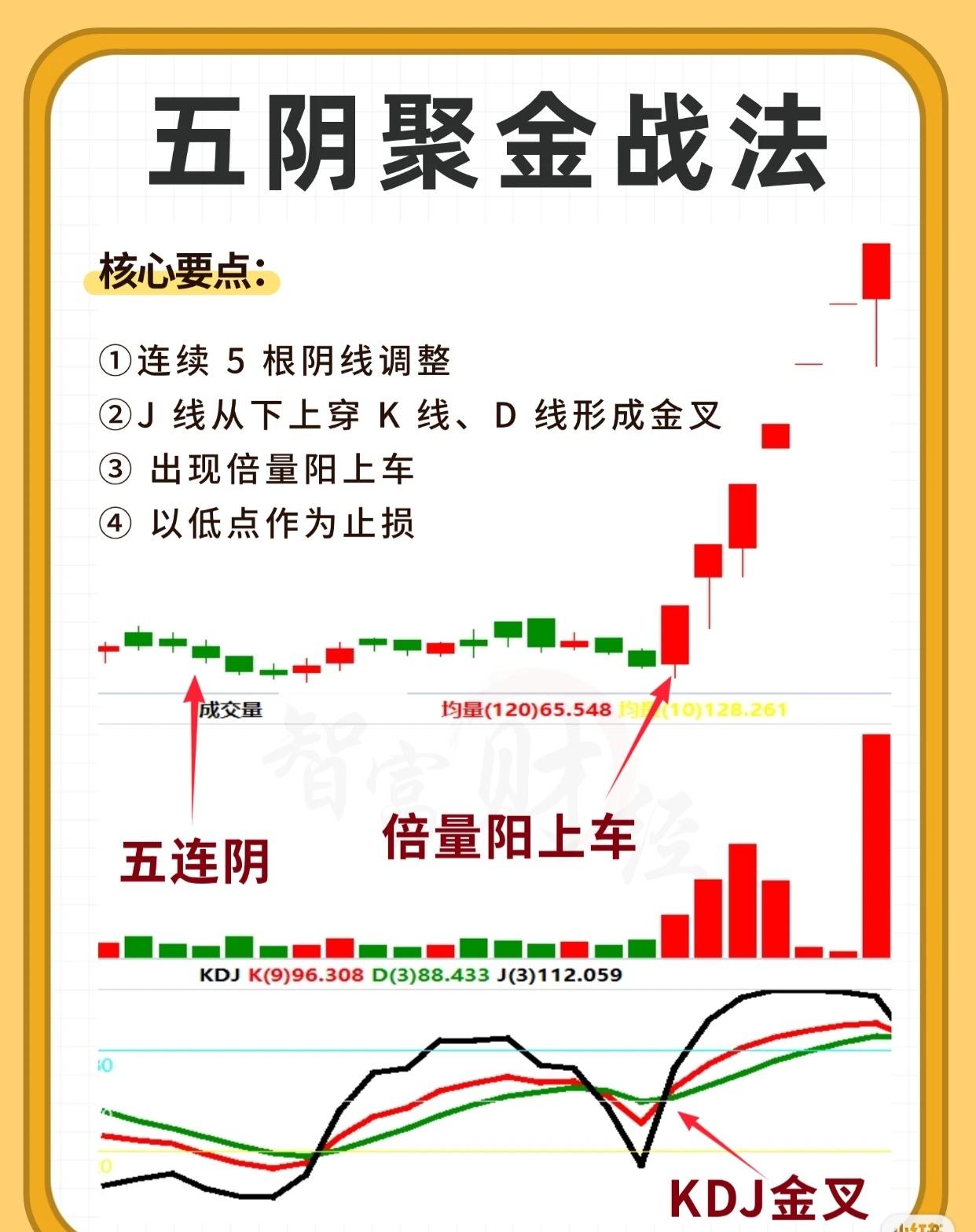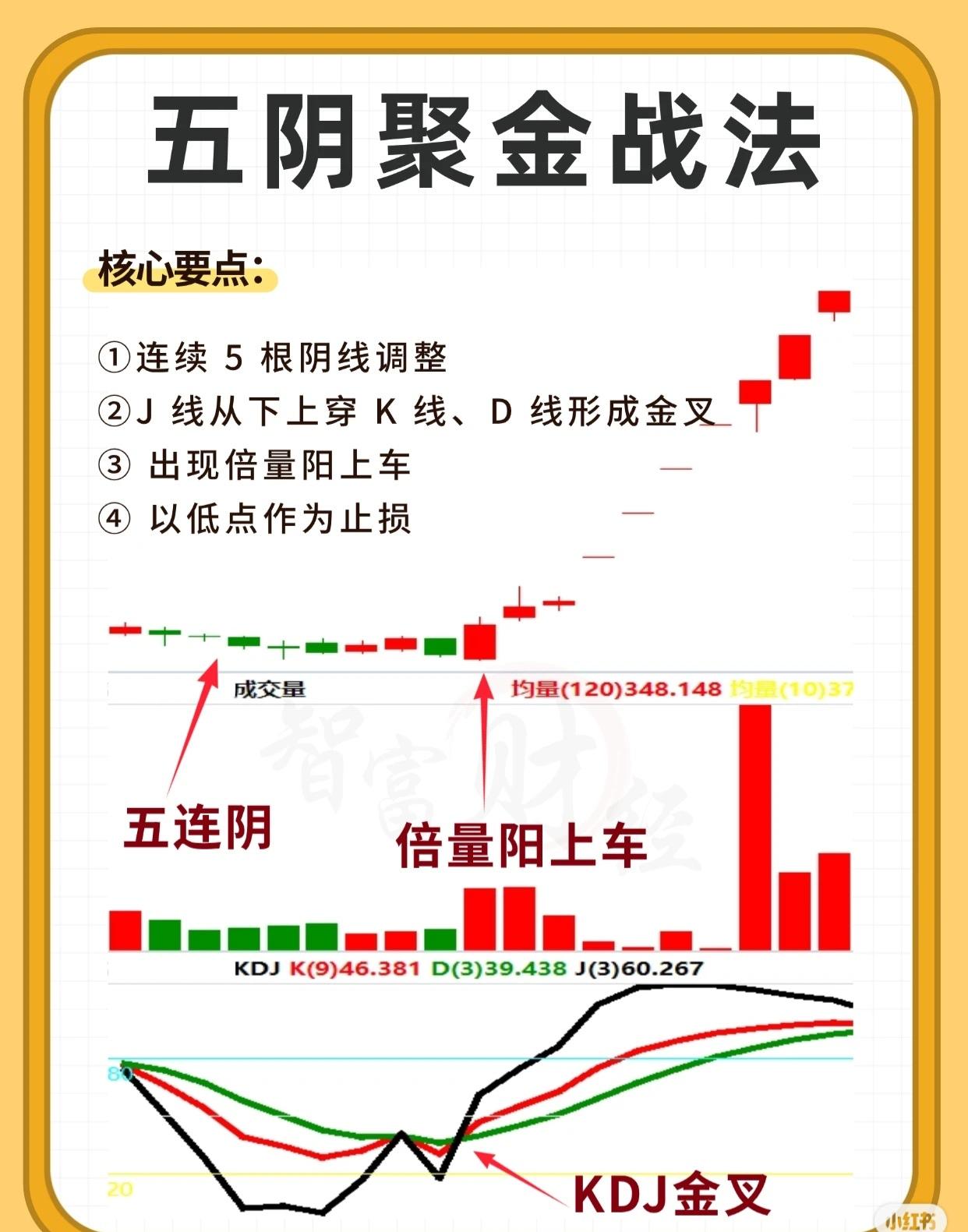 - KDJ指标图:“五连阴”末期KDJ三线(K、D、J)处于低位,“KDJ金叉”时J线向上穿K、D线,后续J线率先上扬、K/D线跟随,验证趋势转强。