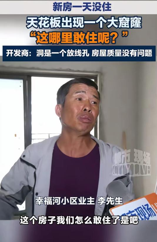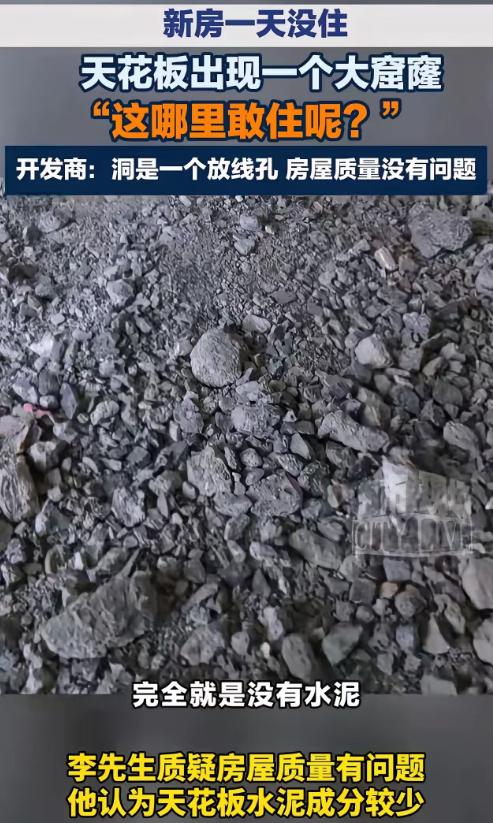 “拿生命安全当儿戏!”江西南昌,新房一天没住,天花板出现一个大窟窿,男子子哭诉:“这我哪里敢住?完全没有水泥!”开发商神回复:“洞是一个放线孔,房屋质量没有问题 !”网友:事实摆在面前,还敢这样说话,了不起!