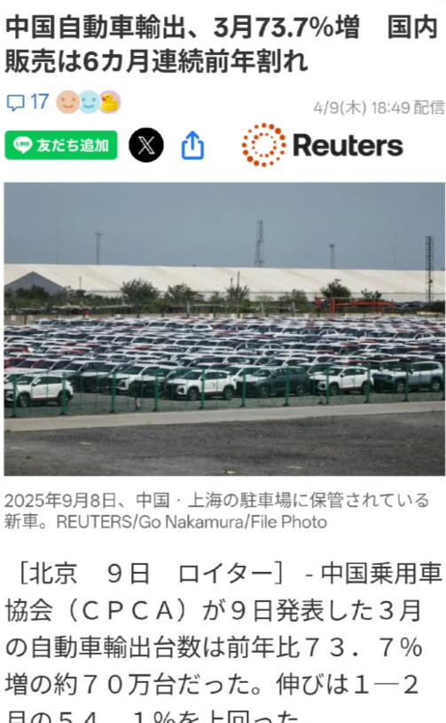 路透社:哪怕中东危机搅乱红海航运,中国汽车出口依然加速狂奔,连日本媒体都酸了:“中国车出口暴增73.7%,国内销量却连跌6个月”。