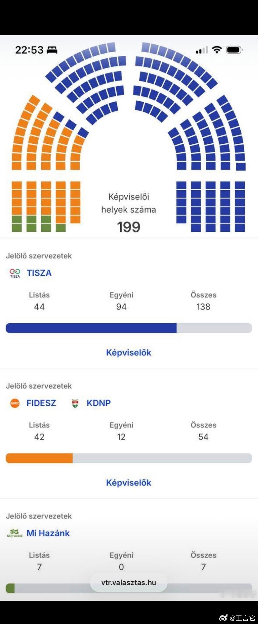 在匈牙利选举中,91.9%的选票统计后,马扎尔领导的蒂萨党继续保持宪法多数席位——议会中138个席位。