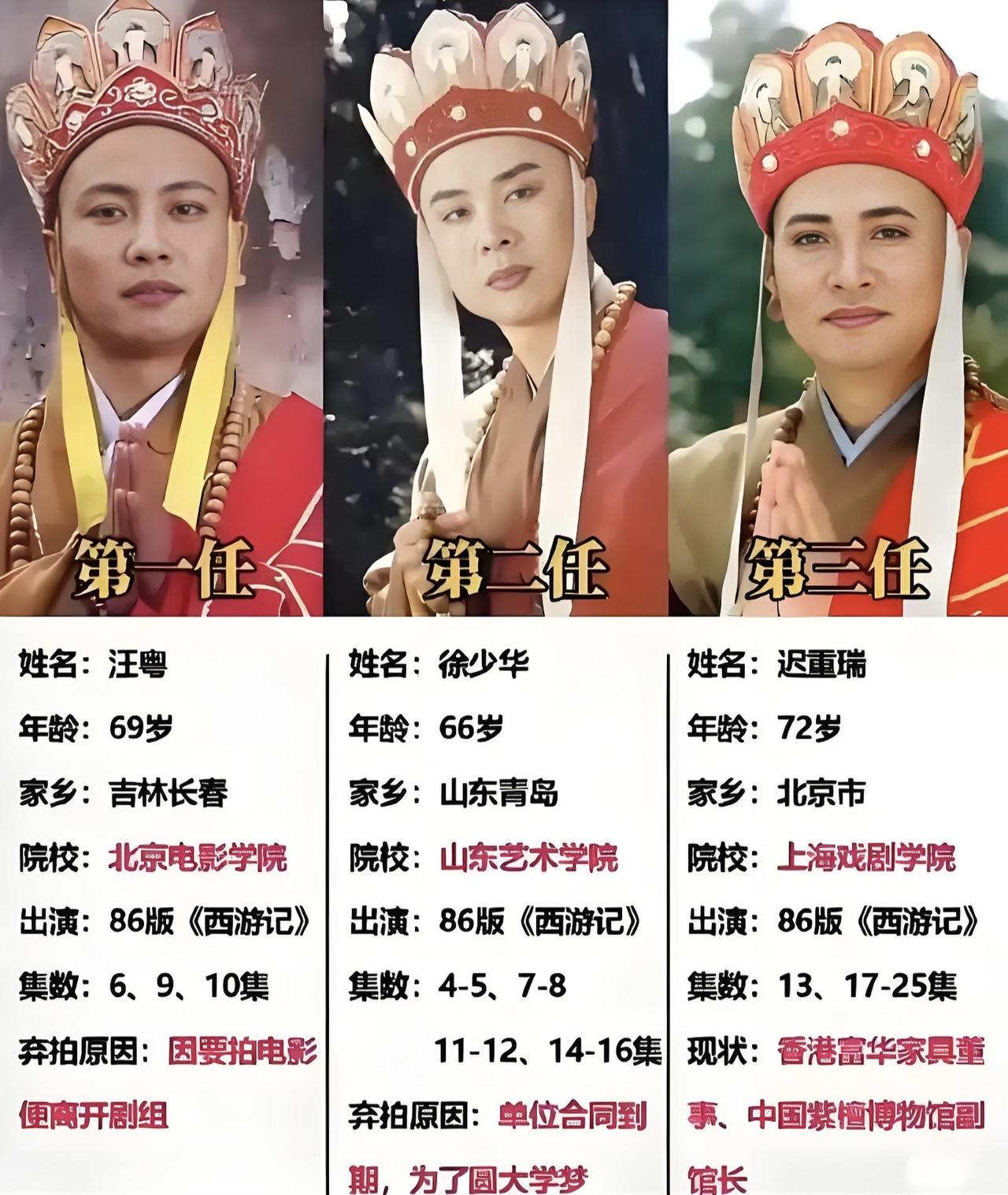 第一位唐僧汪粤因电影机会辞演,现在成了大学副教授;第二位唐僧徐少华因片酬和上大学机会辞演,现在四处接商演;第三位唐僧迟重瑞,拍完全剧,娶了企业家,身价上亿。
