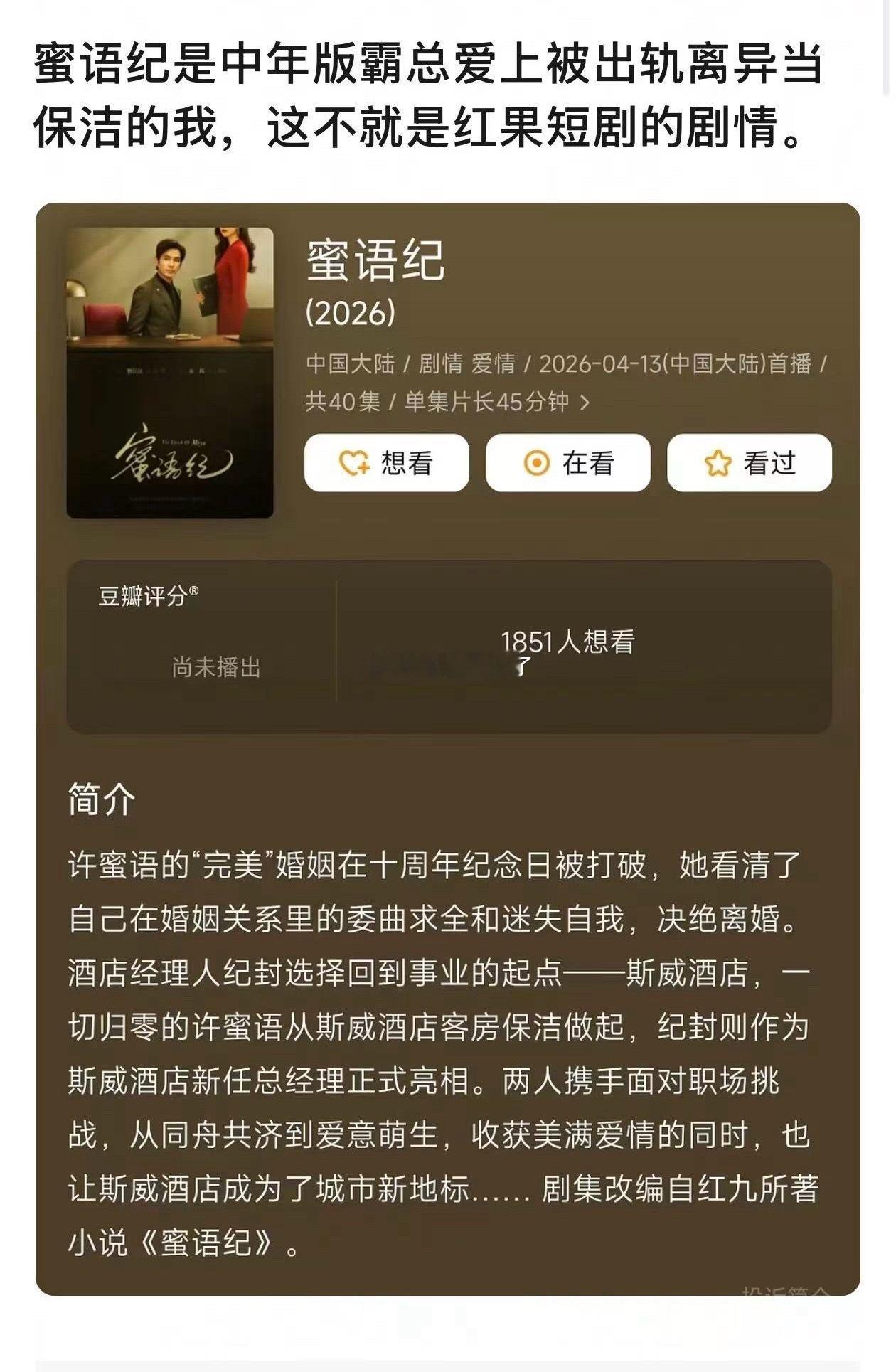 蜜语纪开播蜜语纪终于开播了,这个剧从开拍就幺蛾子不断,朱珠自宣大女主剧钟汉良粉丝不满,现在又有网友说这个剧三观不正,杂糅了好多短剧的狗血元素,钟汉良太老了,40岁的老霸总爱上二婚保洁,朱珠形象气质这么艳丽,演保洁到底是谁想到的,选角太差了,网友一致看扑。