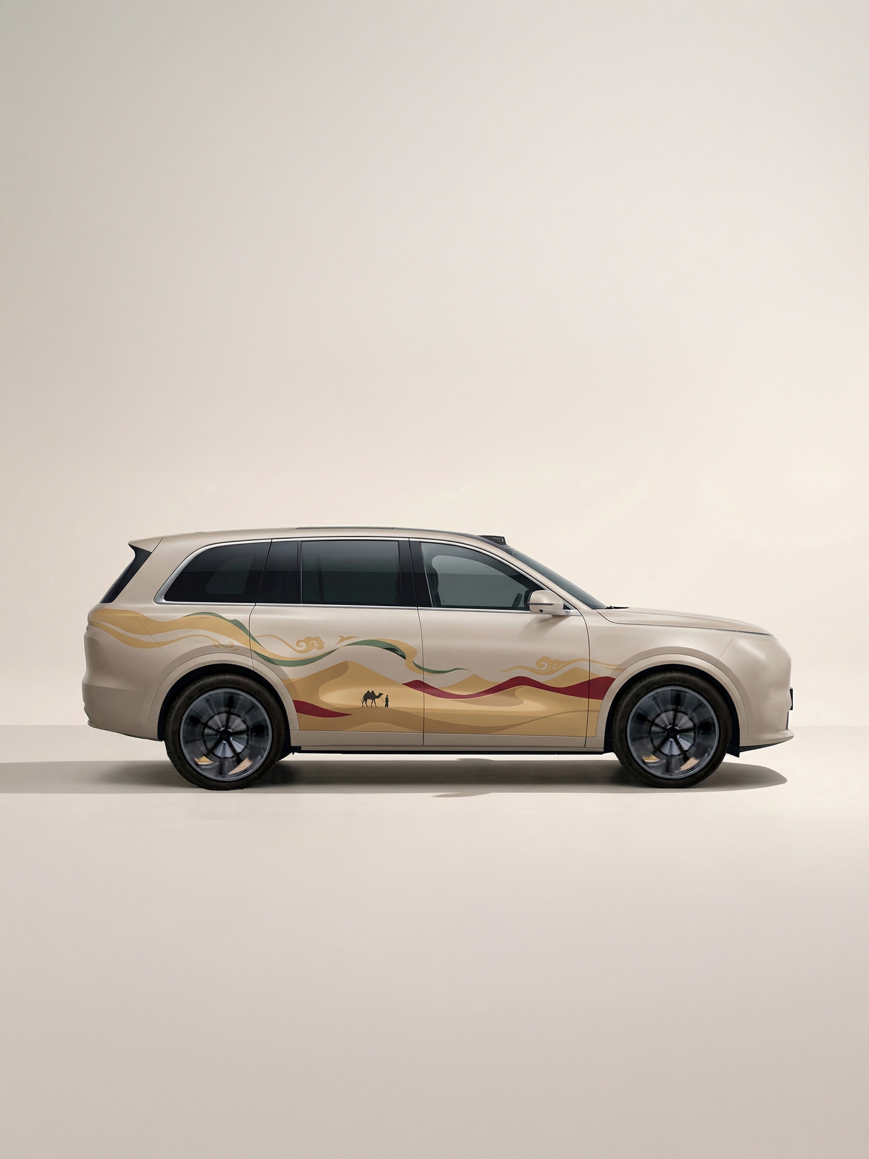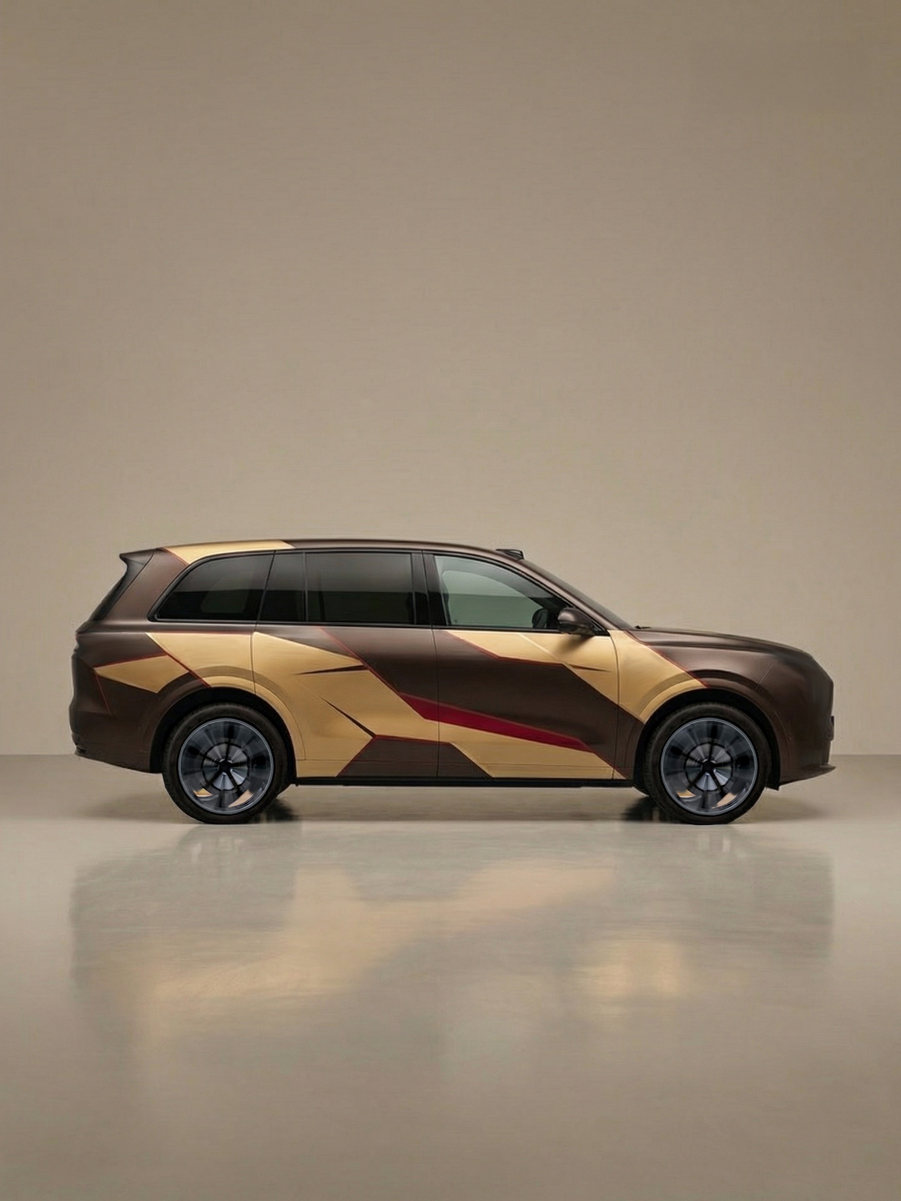 那我就来设计几套适合它的车衣,理念就是让品牌色当主角。第一个思路,以几何解构美学为核心设计语言,用大面块几何切面重构车身轮廓,每一道切割线都精准贴合车身线条,,让平面涂装与立体车身完美融合,强化整车的力量感与雕塑感。色调上选用深棕、暖金双主色,以一抹朱砂红做视觉点睛,低饱和度配色自带温润高级感,哑光质感更显低调奢华。第二个思路,我想到了敦煌,这台车具备这样的磅礴且有底蕴的气质。整体设计以车身为画布,将大漠沙丘、丝路驼铃、祥云瑞气等敦煌标志性元素,以国风写意笔触融入车身曲面,让流动的沙浪线条顺着车身轮廓自然延展,实现涂装与车身的浑然一体。色调上萃取敦煌壁画的暖金、朱砂、石绿,以车身原生米白为基底,复刻出千年壁画的温润质感,既还原了丝路的苍茫壮阔,又用东方美学赋予车辆独特的文化底蕴。祥云纹样贯穿首尾,驼队剪影点睛,每一处细节都承载着丝路的故事感,让奕境成为移动的东方文化载体,在行驶中尽显大国旗舰的文化气场与专属格调。