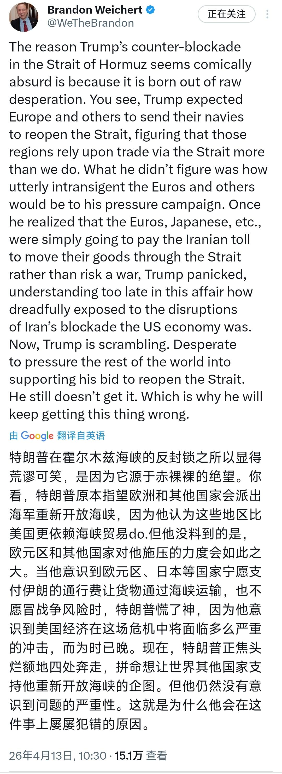 美国著名地缘政治专家布兰登·J·韦切特今天(北京时间4月13日)发文写道:“特朗普在霍尔木兹海峡实施的反封锁行动之所以显得荒唐可笑,是因为这完全是出于绝望之举。要知道,特朗普原本指望欧洲和其他国家派遣海军来重新开放海峡,他认为这些地区对通过海峡进行贸易的依赖程度要高于美国。但他没想到的是,欧洲人和其他国家对他的施压行动竟会如此顽固不化。当他意识到欧洲人、日本人等宁愿向伊朗支付通行费让货物通过海峡,也不愿冒险挑起战争时,特朗普慌了神,这才意识到美国经济在伊朗封锁面前是多么脆弱不堪。如今,特朗普正手忙脚乱,急于迫使世界其他国家支持他重新开放海峡的行动。但他还是不明白,这就是为什么他在这场风波中会一直犯错。”