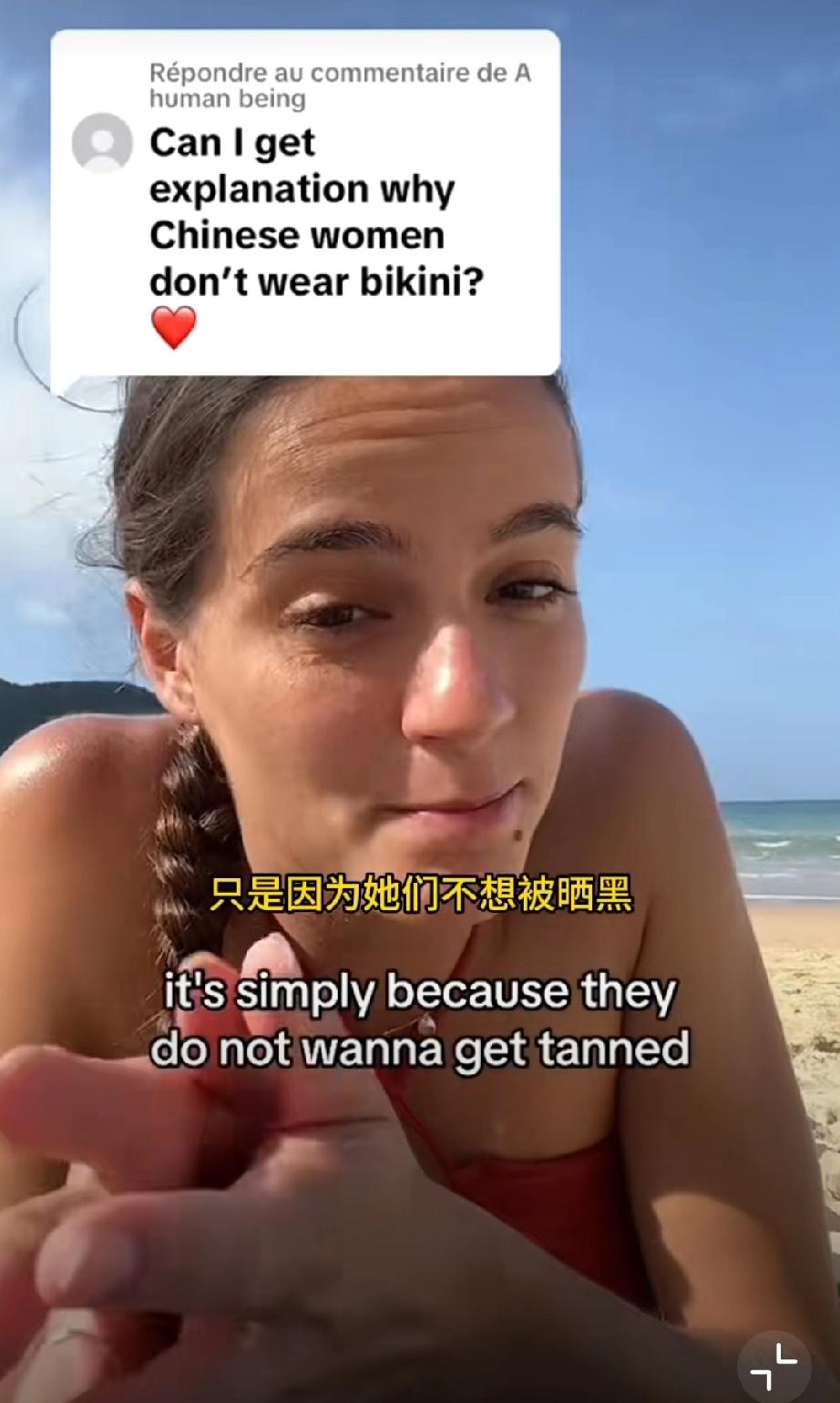 外国网友问:为什么中国女生在海滩上都不穿比基尼? 法国妹子回答说:因为她们最大的