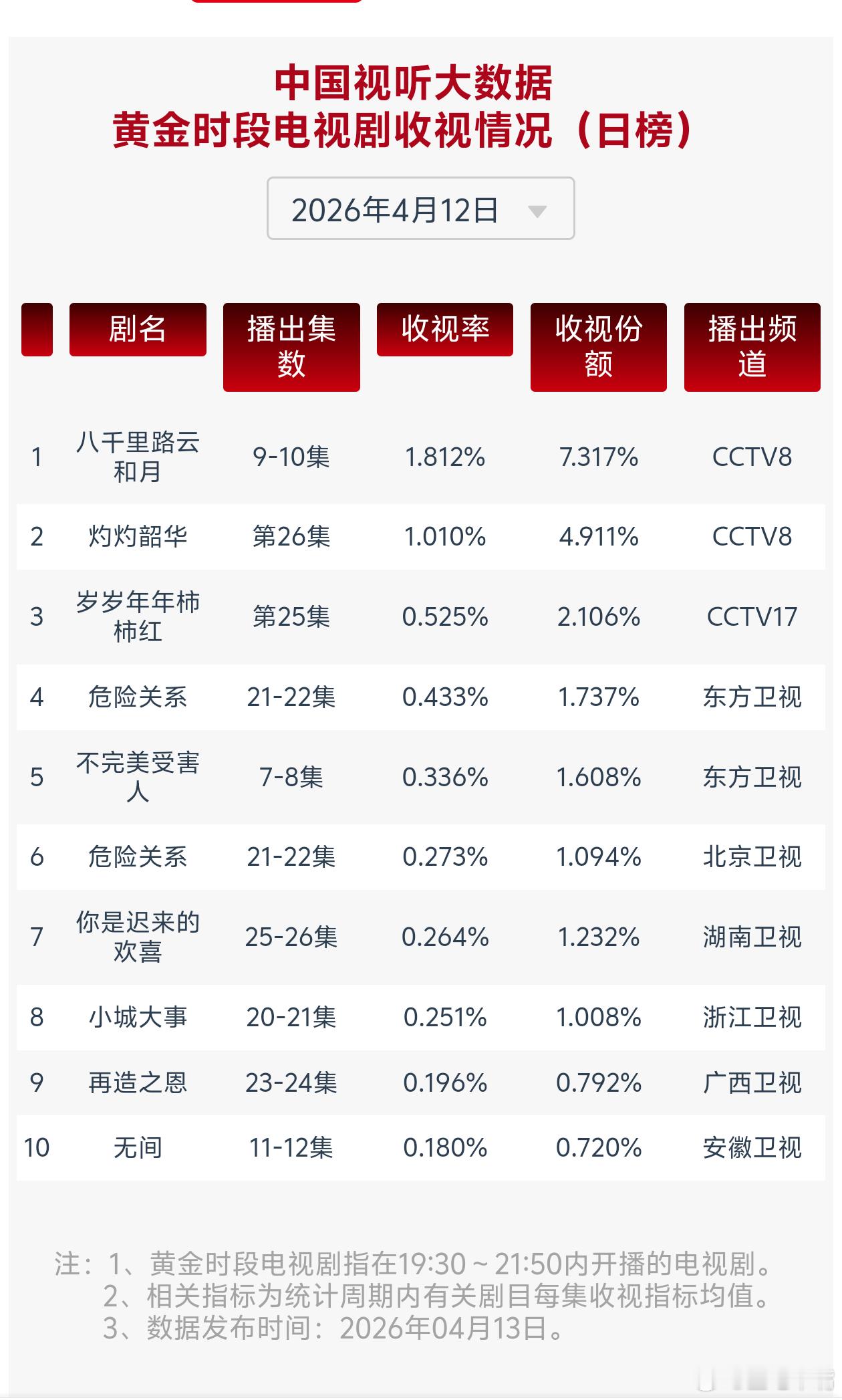 电视剧八千里路云和月4月12日cvb收视日报!八千里路云和月1.812,酷云1.9661,系数0.922