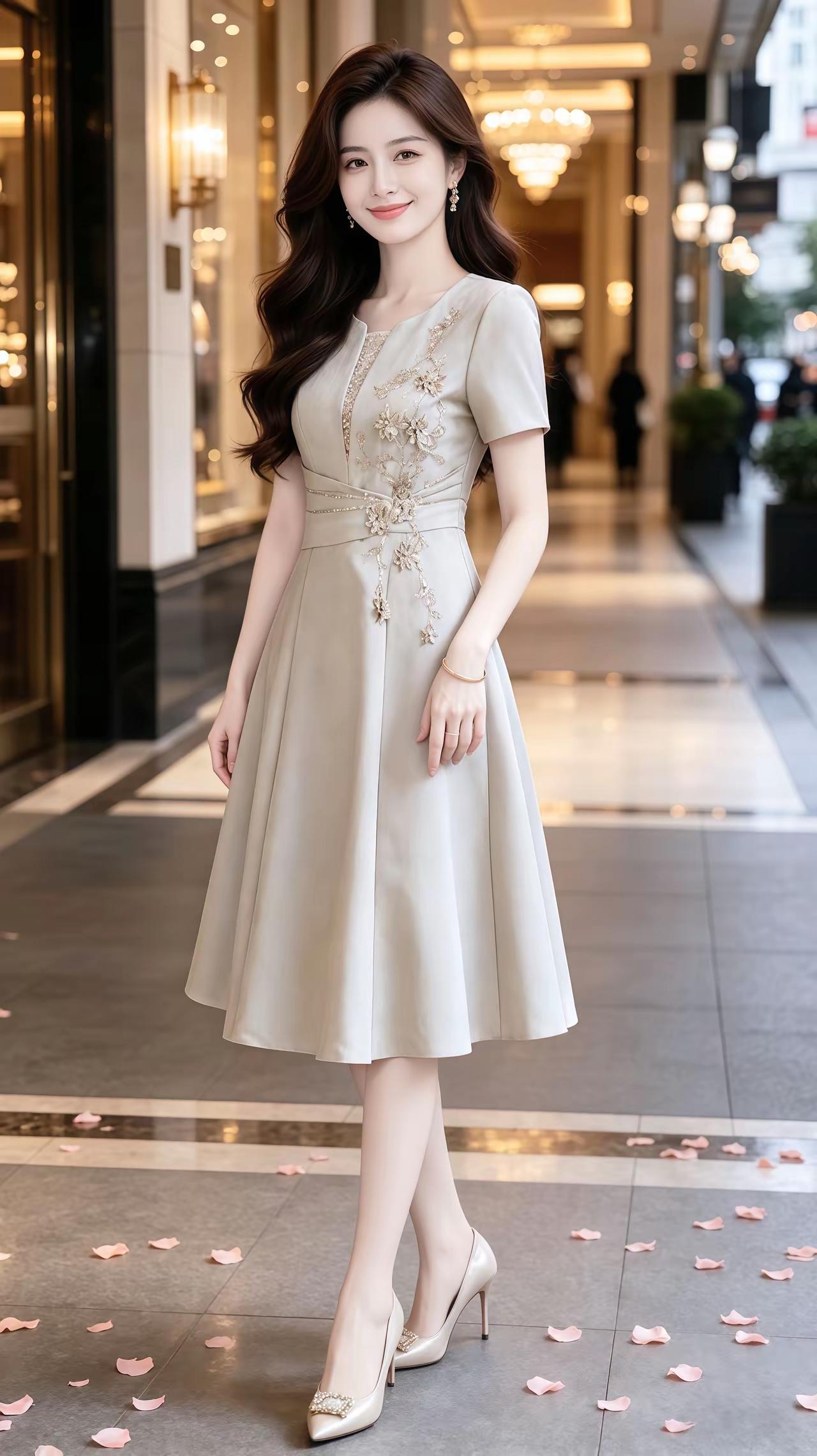 优雅气质,浅米色连衣裙,精致刺绣,高跟鞋,都市时尚。