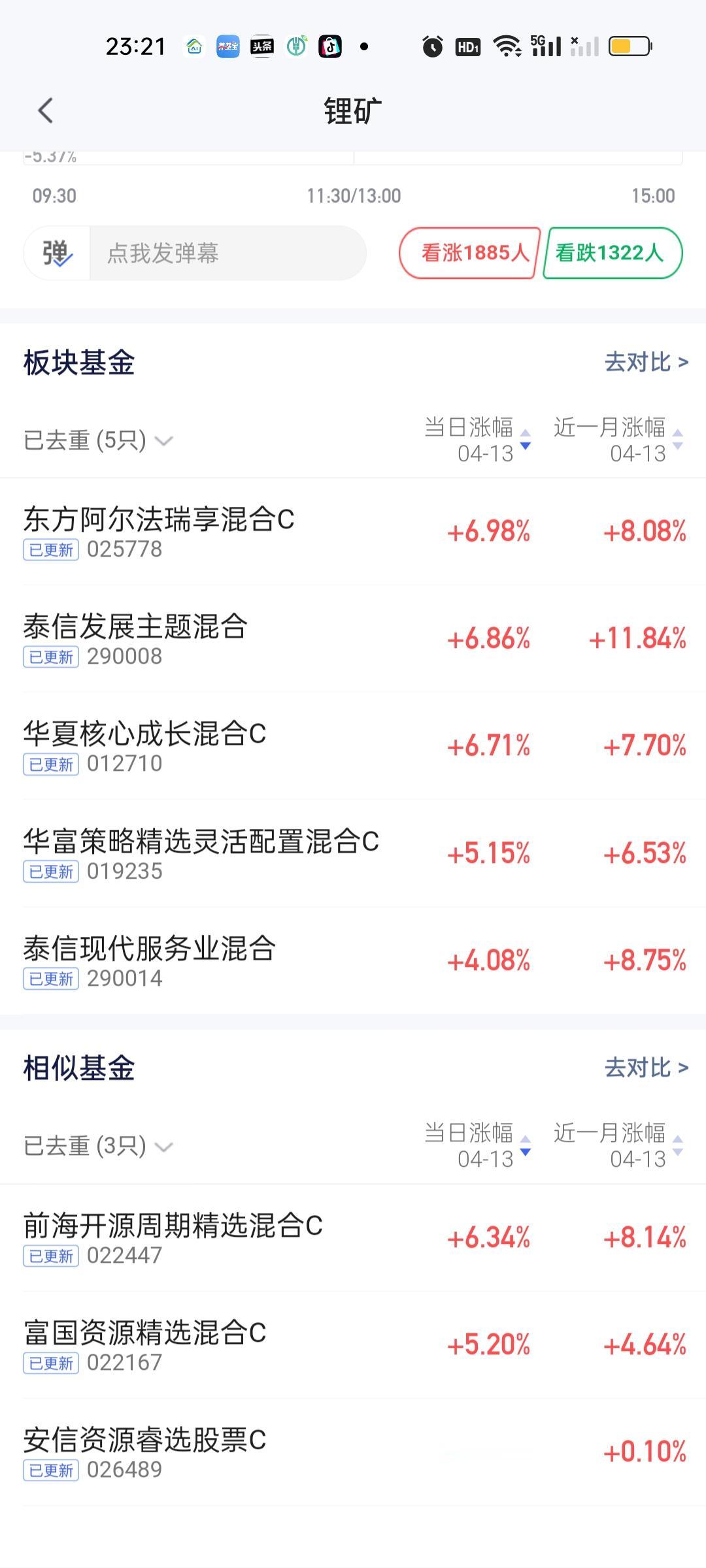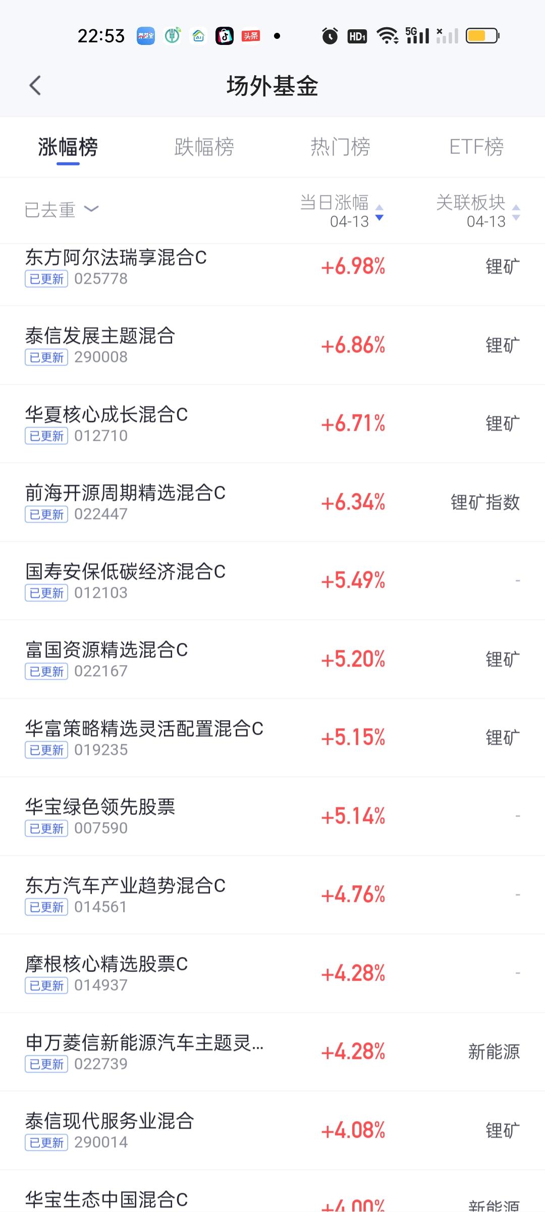 今天锂矿板块的基金表现的非常强势。板块榜也是断崖式领先其它板块。这不得不引起足够重视。从净值榜来看我们选取了今天榜单前12名的基金做数据对比。纯血锂矿基金必定就在这12只基金里面。