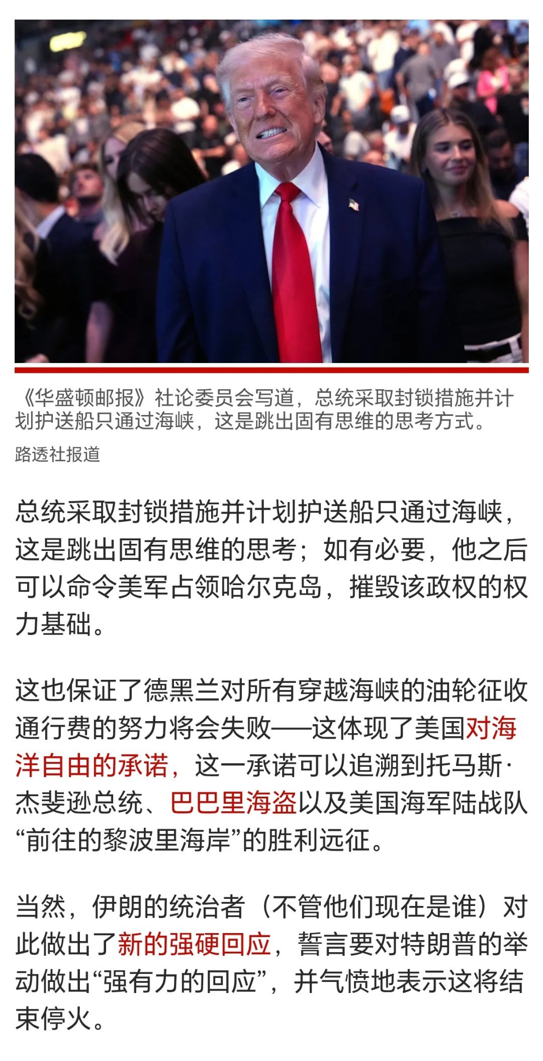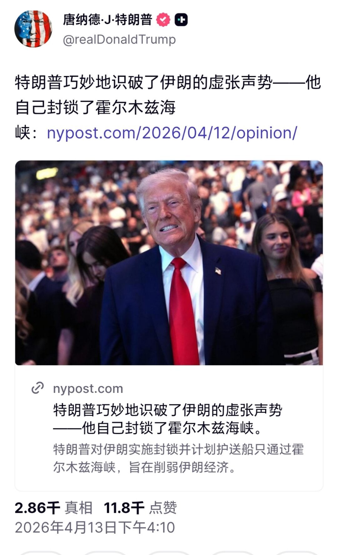 特朗普自夸识破伊朗虚张声势特朗普转发吹捧自己的文章:特朗普巧妙地识破了伊朗的虚张声势——他自己封锁了霍尔木兹海峡。