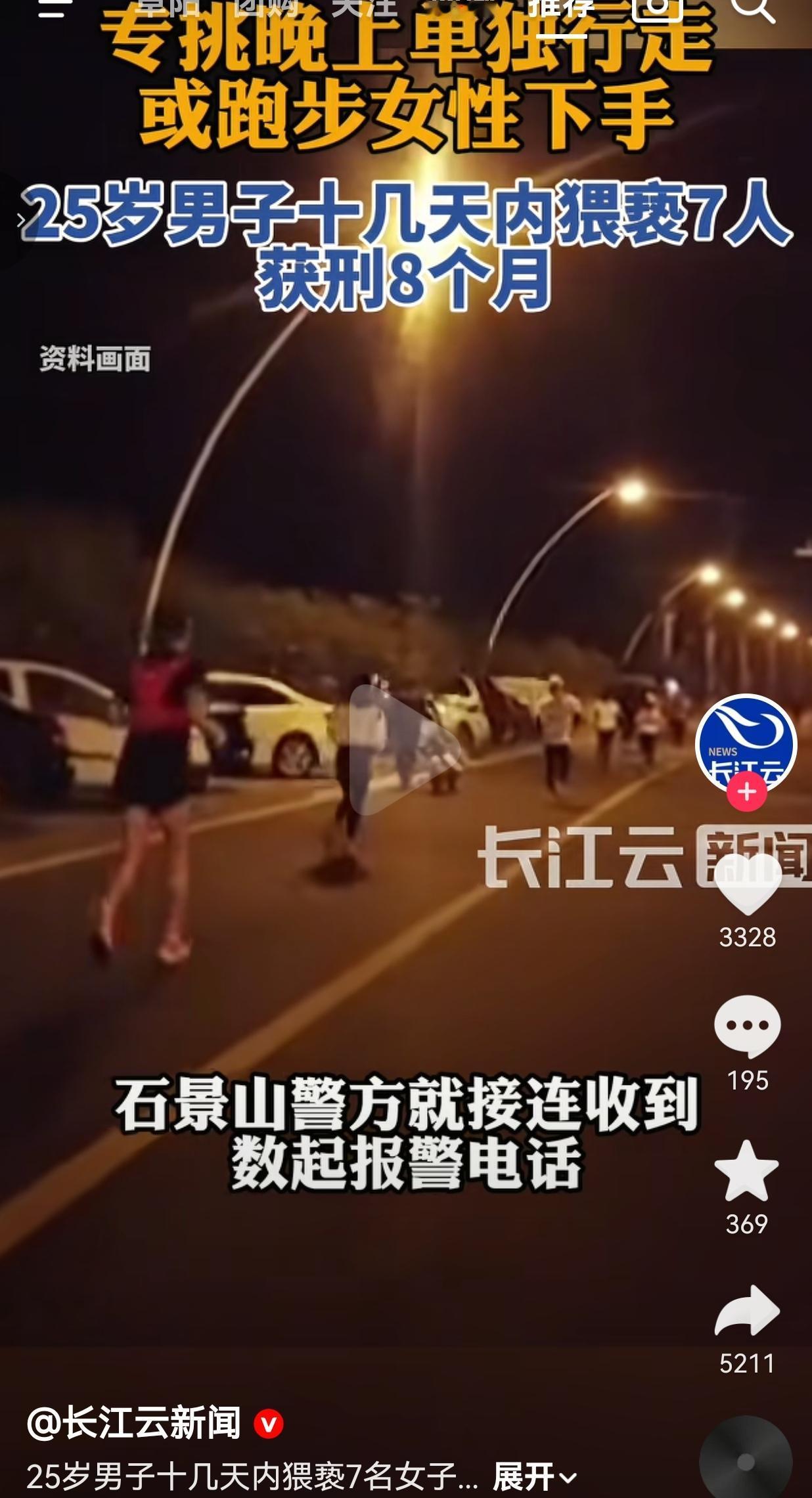 太气人了!北京石景山25岁男子王某,专挑晚上单独走路、夜跑的女性下手,短短十几天猥亵7名女性,最后被判有期徒刑8个月。网友:自作孽不可活!
