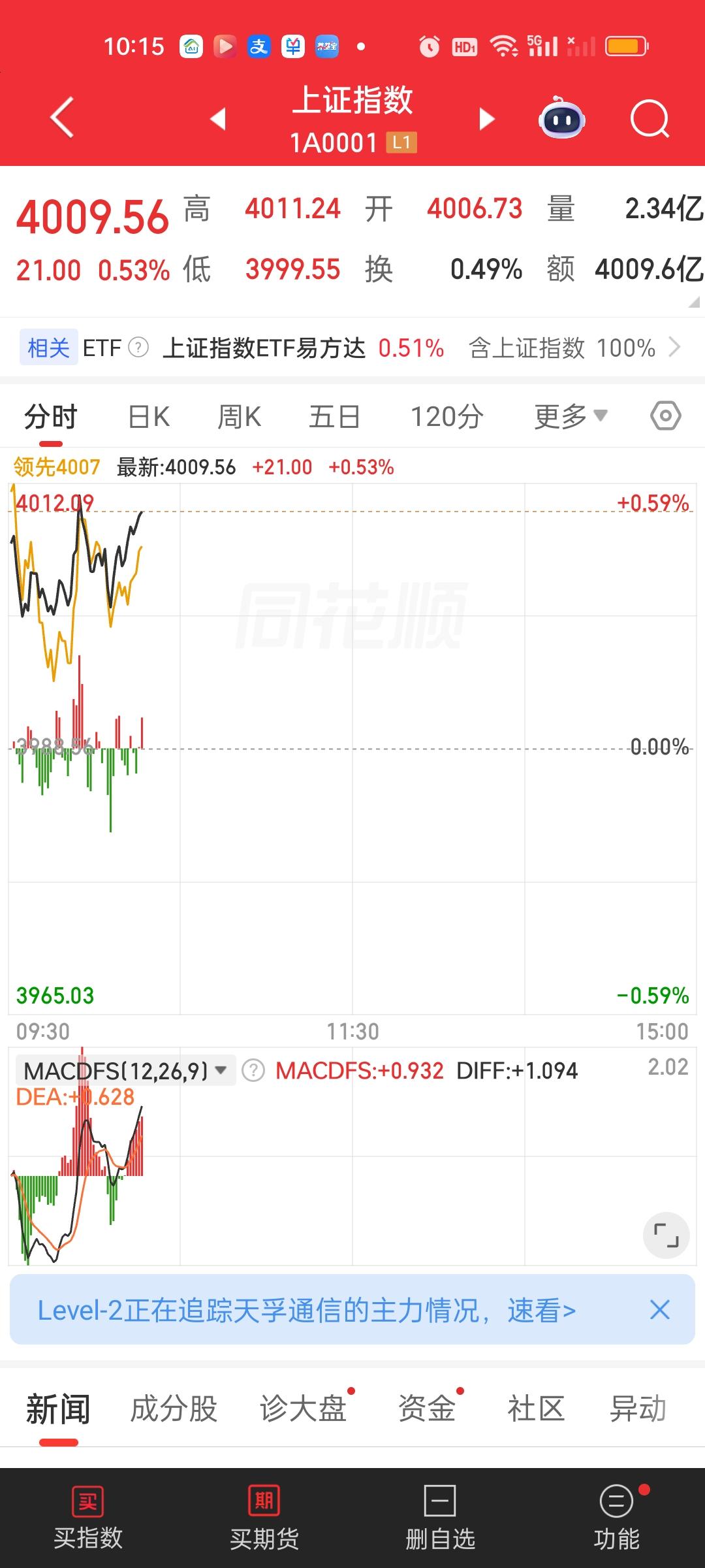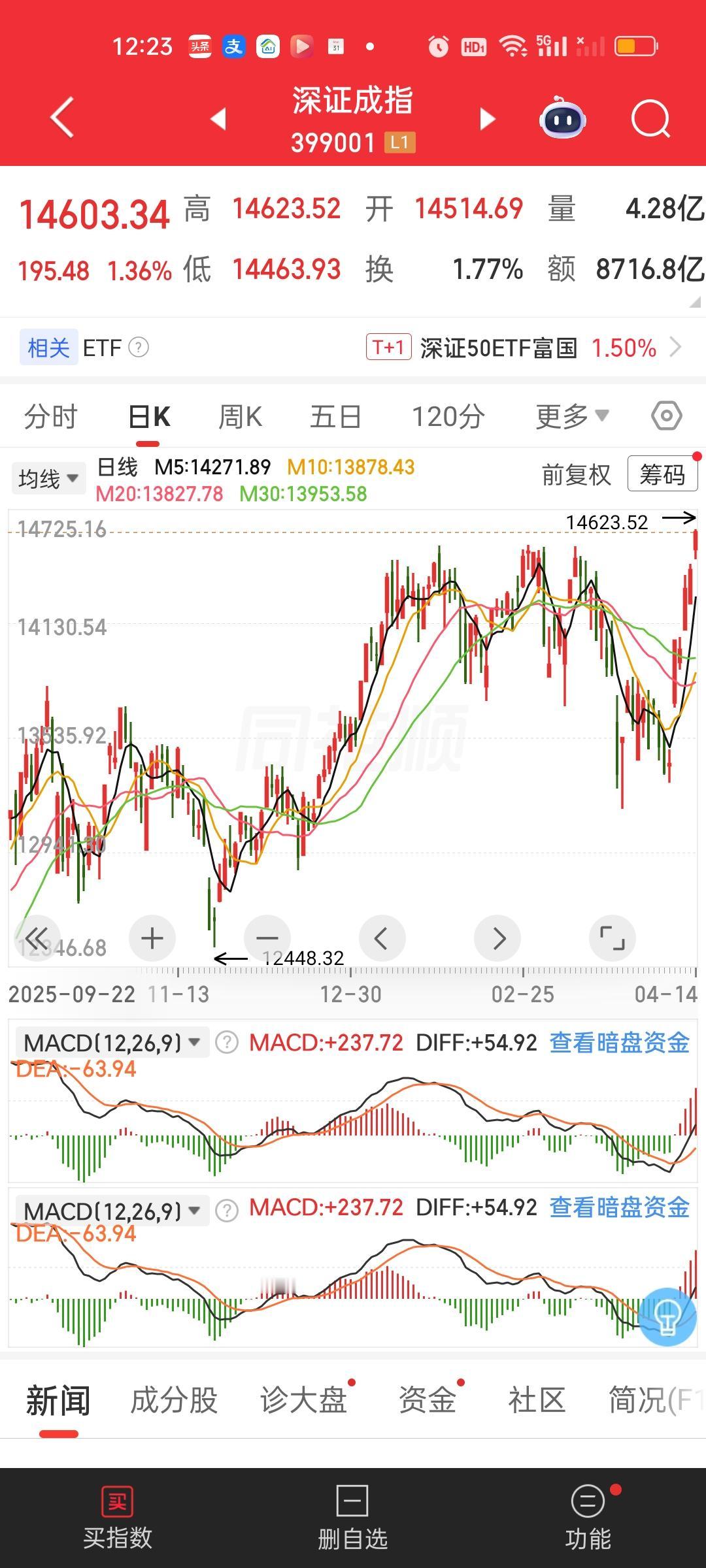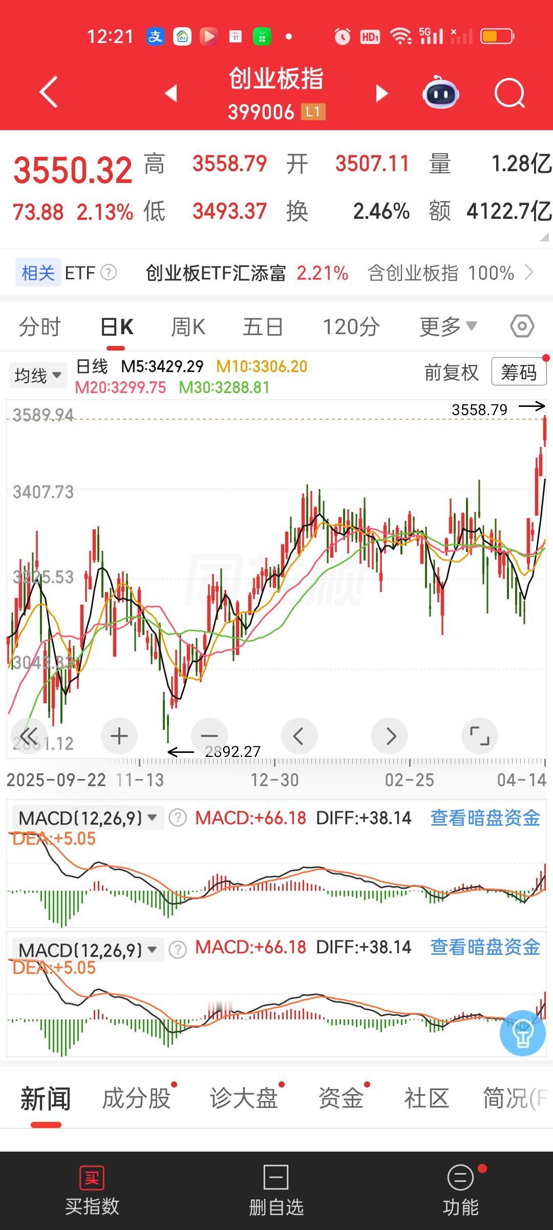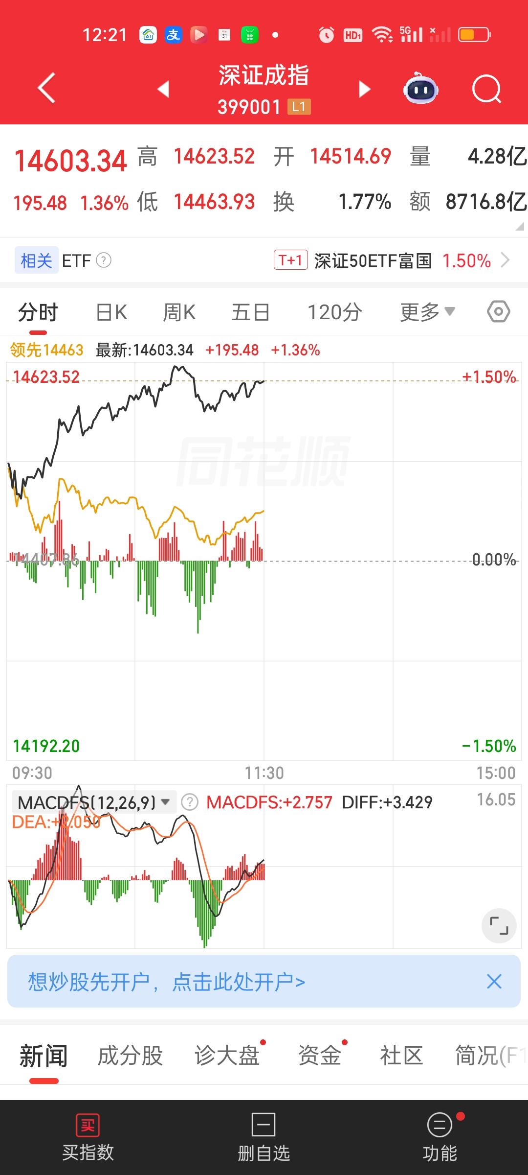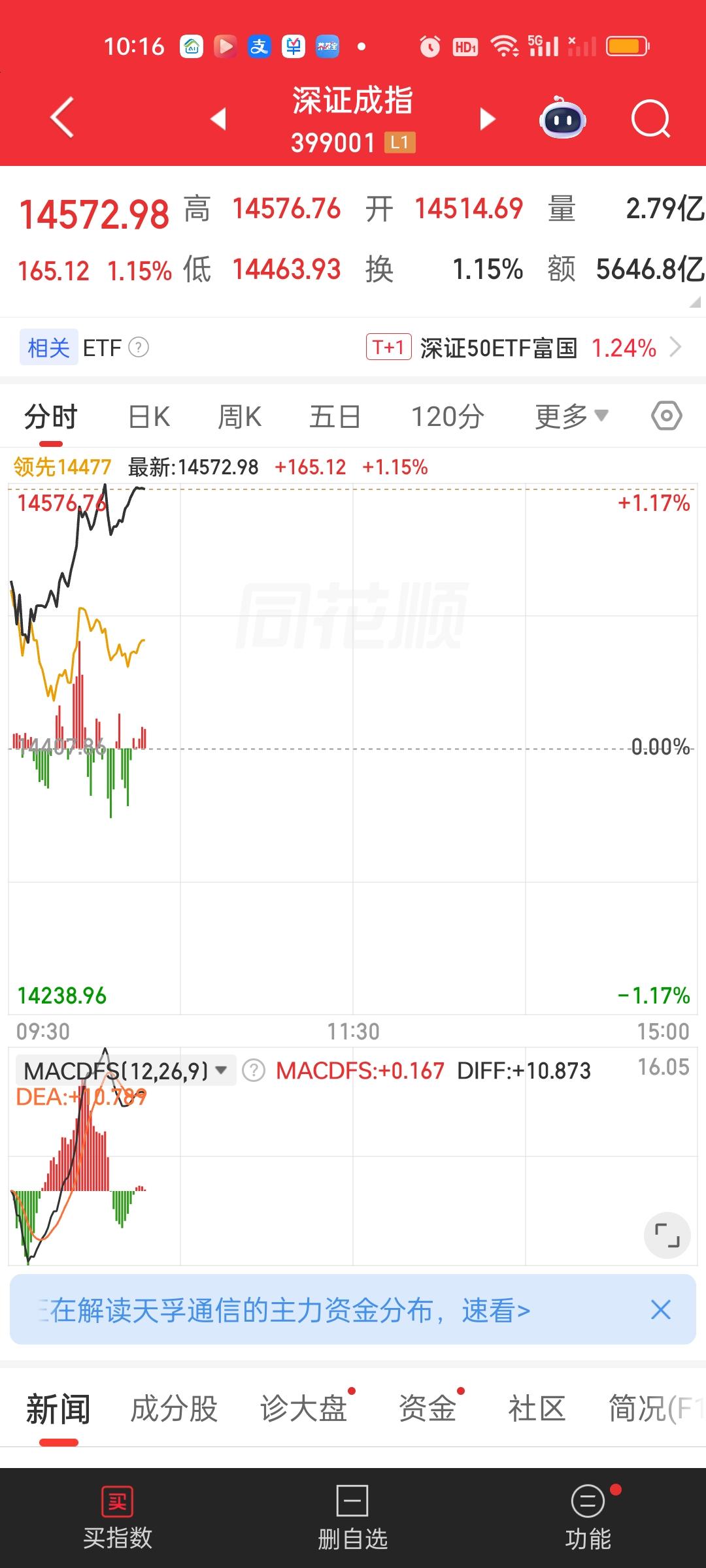 中午收盘来看,深圳成指创出近5年新高,创业板指再创新高。成交量放量947亿,大盘资金净流出51.84亿,但上涨家数和下跌家数几乎一致,涨跌停比57:7,有一半的个股还是跌的,这说明今天并不是普涨行情,而是明显产生分化了,有的板块能赚钱,有的板块依旧会产生亏损。