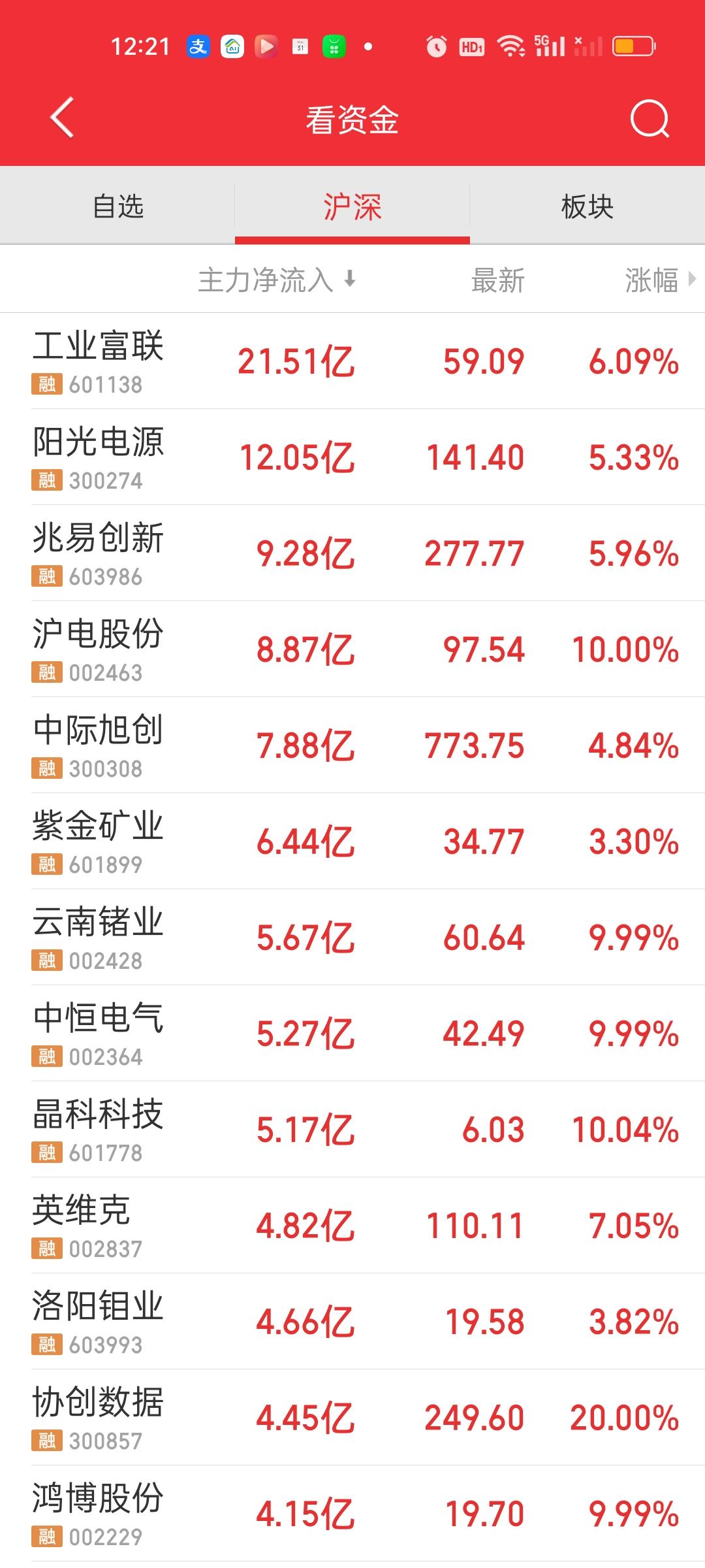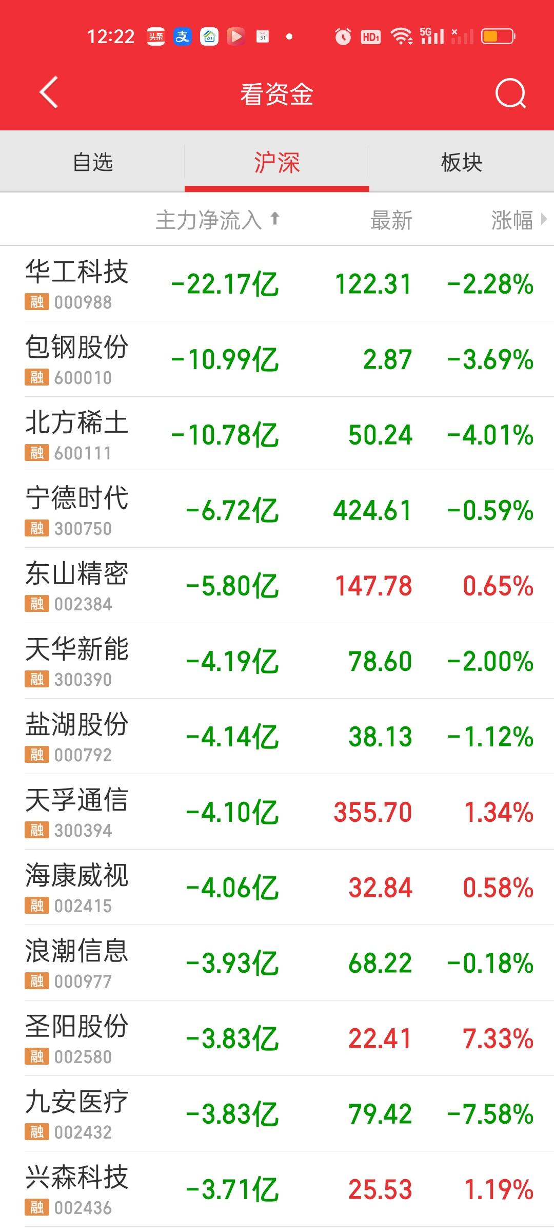 主力资金净流入超10亿的个股有工业富联和阳光电源,净流出超10亿的个股是华工科技,包钢股份和北方稀土。