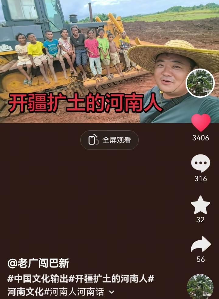 比如抖音上这位名叫“老广闯巴新”的河南主播,平时经常发布一些他在非洲的工地上教非洲小孩子说河南话的视频——