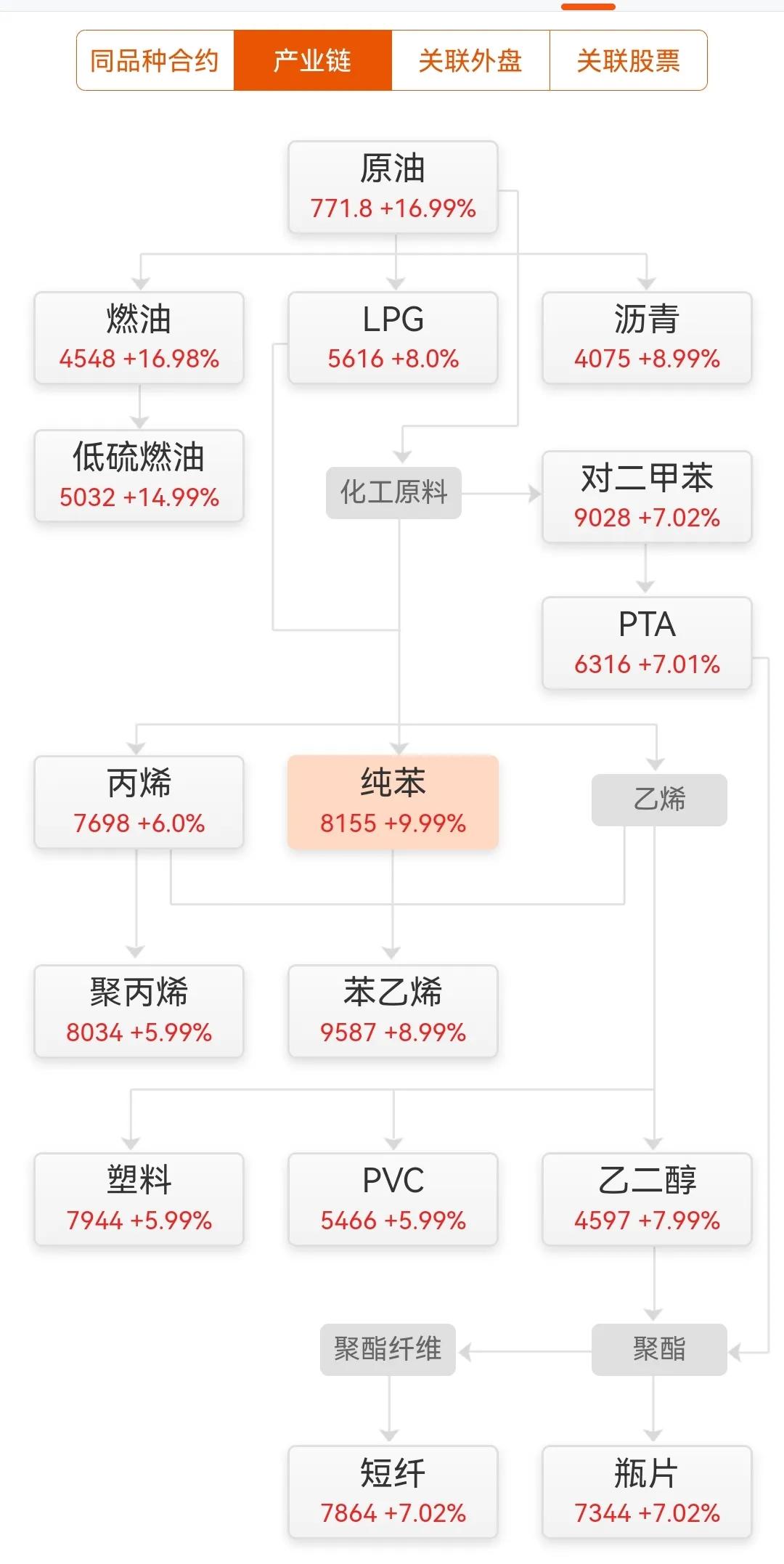 但是还有一点,石油毕竟是工业之母,它不仅仅是燃料,也是PVC,甲醇,乙醇,乙烯,丙烯等一大批化学产品的提取物,油价大涨之后,这些化工产品的价格也瞬间噌噌噌的暴涨。