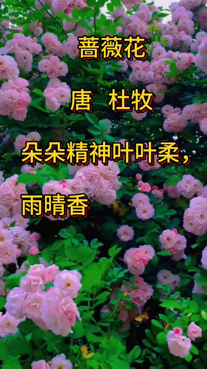 蔷薇花。 唐,杜牧。 朵朵精神叶叶柔,雨晴香拂醉人头。 石家锦帐依然在,闲倚狂风