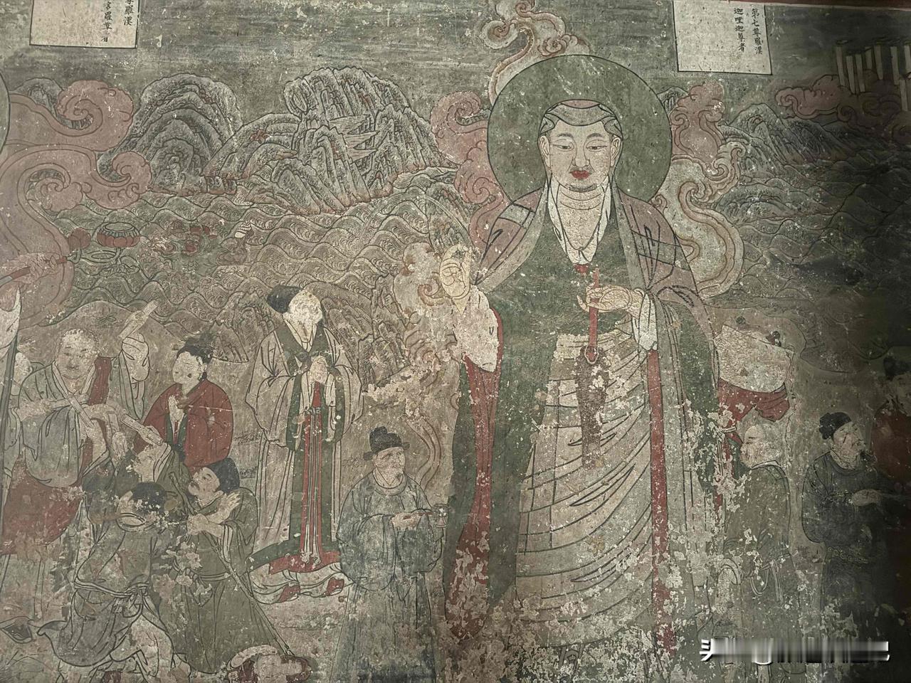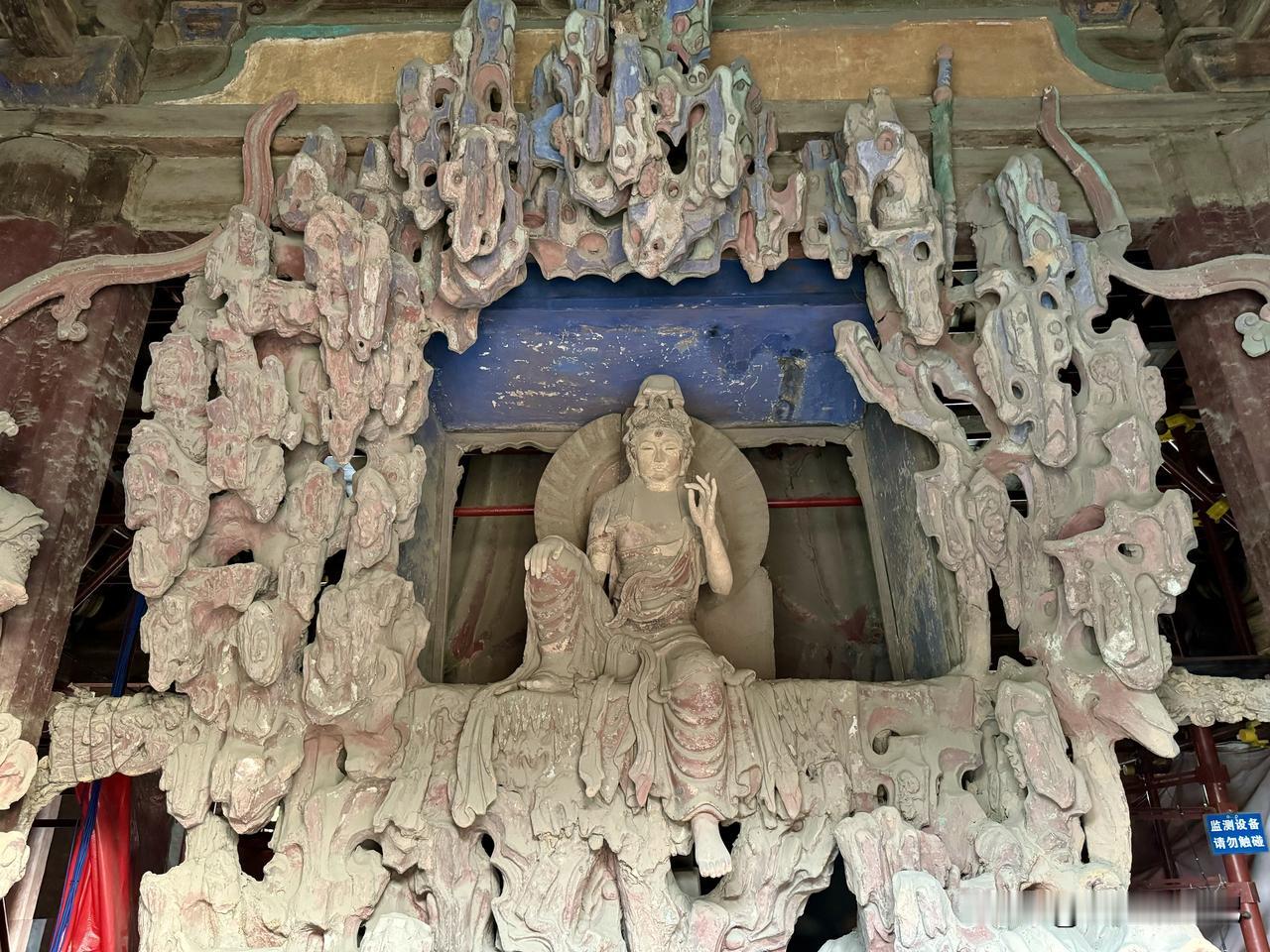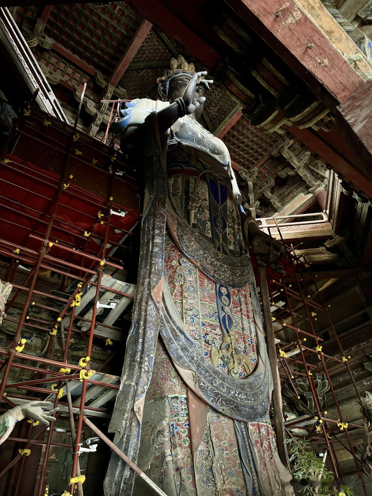 这座观音像高达16.08米,在观音的头上还有许多小造像,这是一座十一面观音像,也是我国最高大的泥塑站像。在周围的墙壁上就是在元代绘制,明代重描的十六罗汉及二明王彩色壁画。