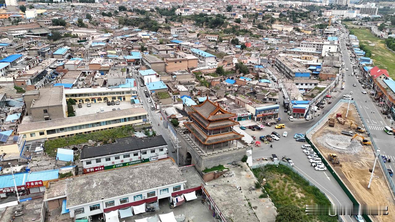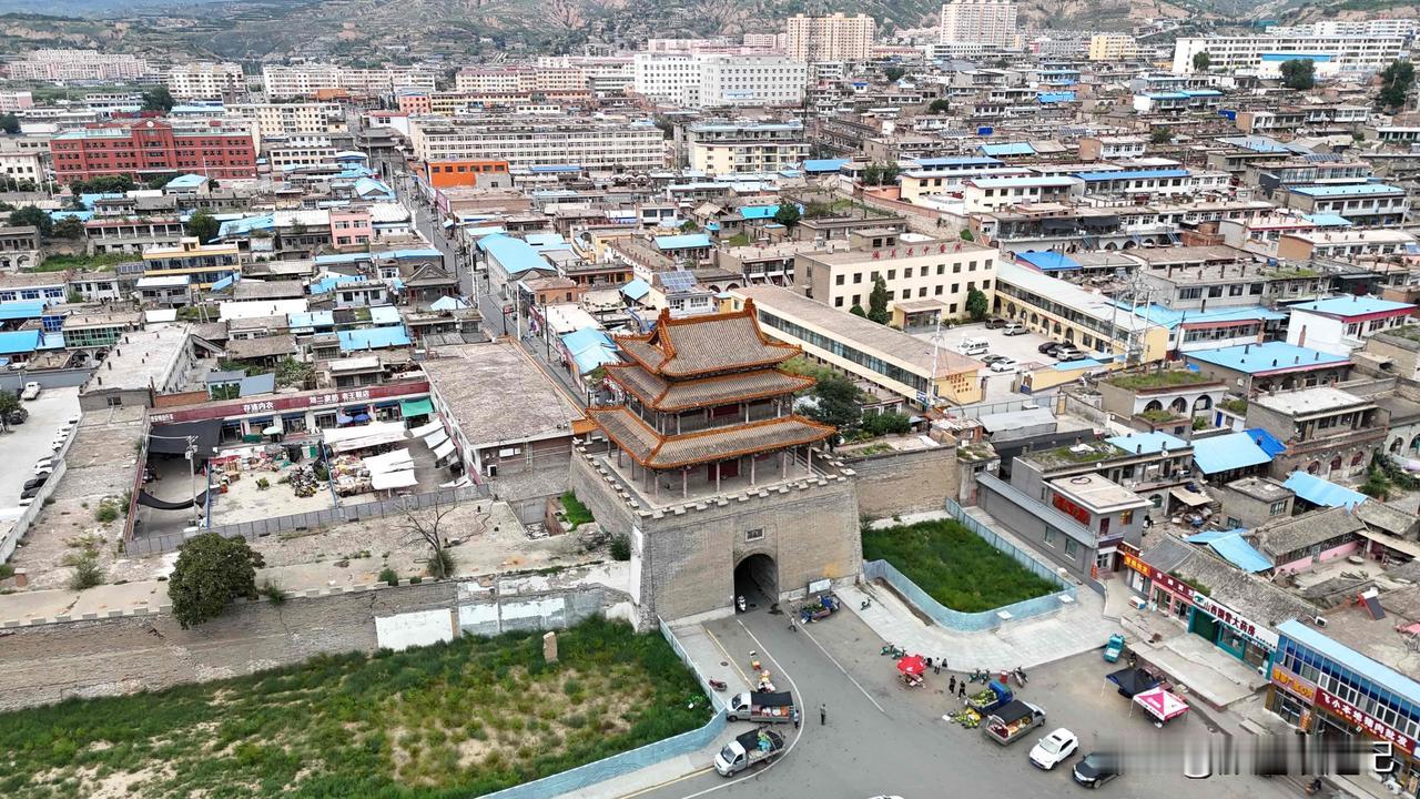 从高空俯瞰整个偏关县城,东西两侧各有地标,东侧是文笔塔,文笔塔也可以叫文峰塔、文昌塔、文光塔等,主要用于祭祀传说中掌管文运功名的神灵文昌帝君。古代建设文峰塔的目的是希望当地文人多多中举。在城市的西侧是护城楼,如今是一个博物馆,向我们讲述偏关的历史。