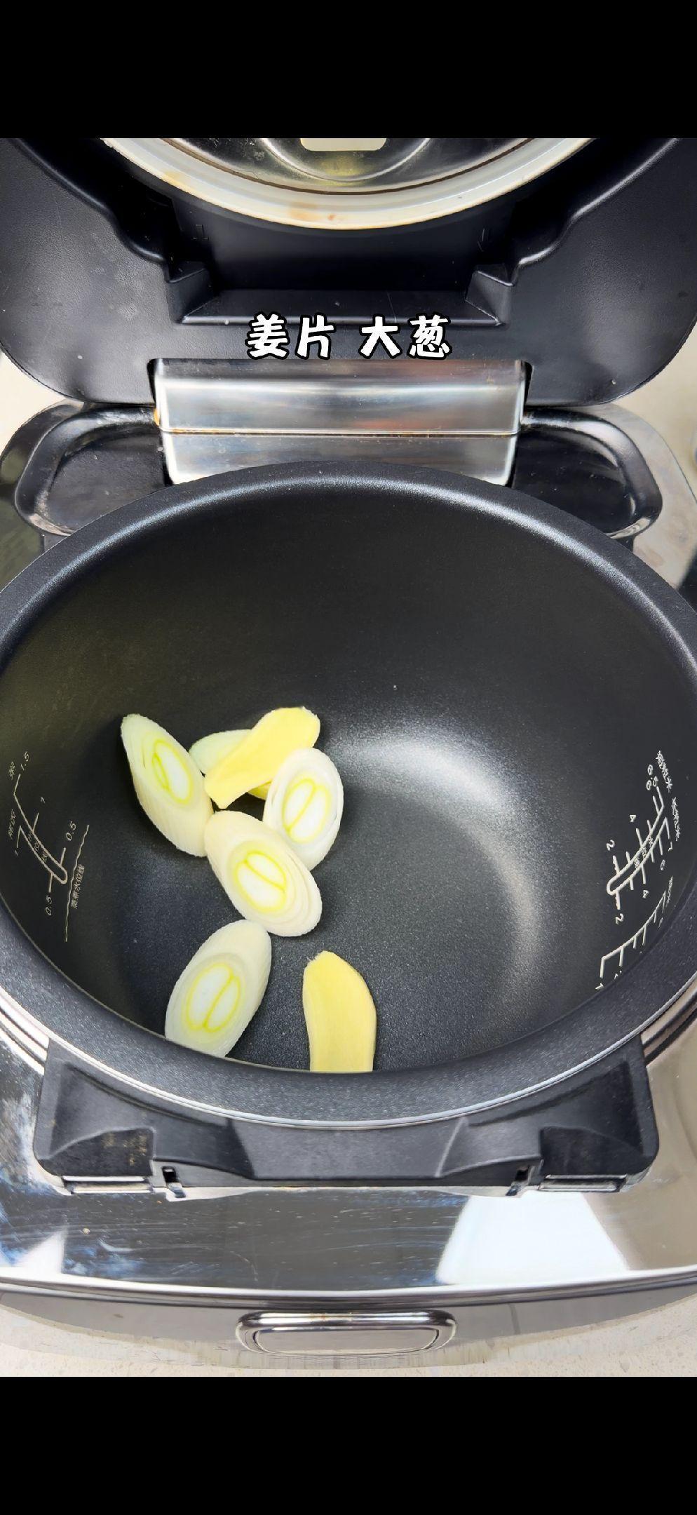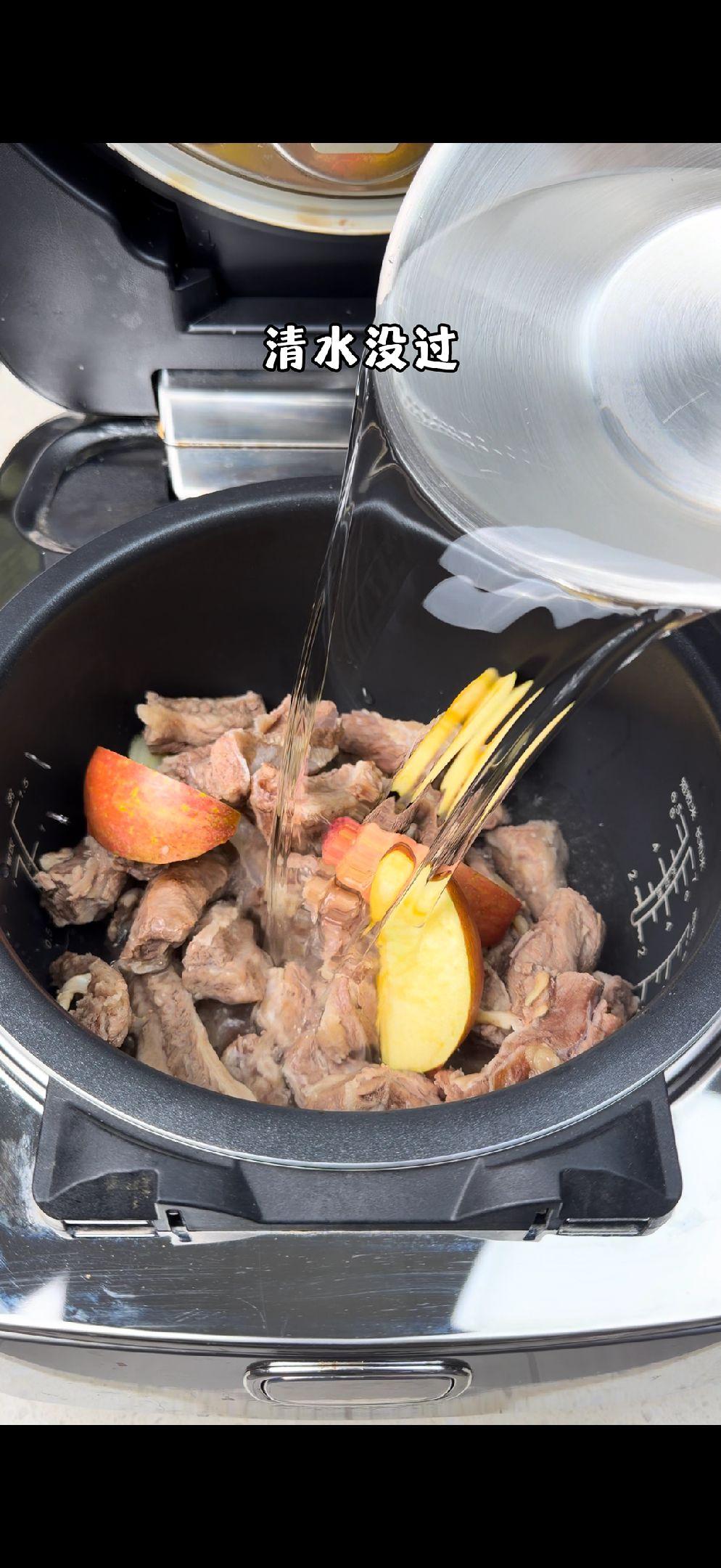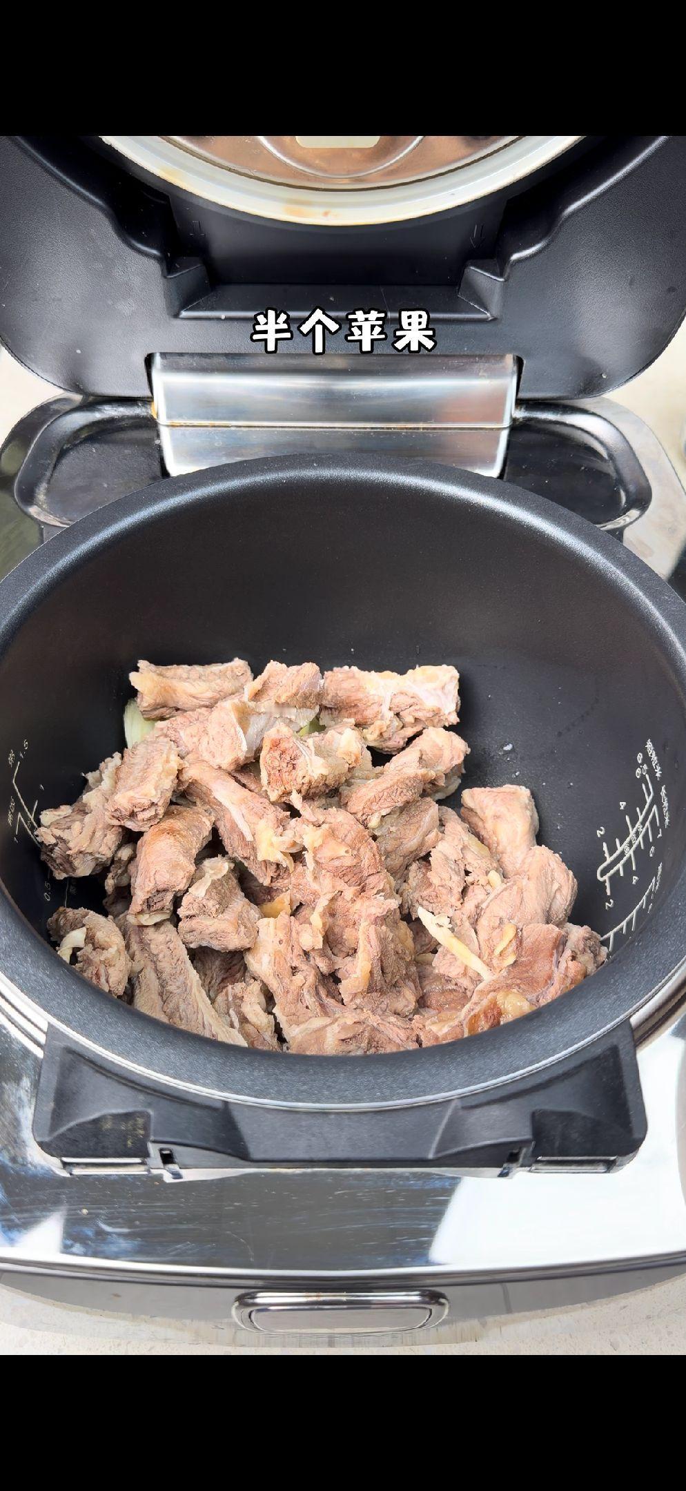 2️⃣电饭煲烹饪:牛肋条、姜片、大葱、半个苹果放进电饭煲,加清水没过食材,扣盖按精煮饭键煮2遍(中间开盖翻拌一下更均匀)~
