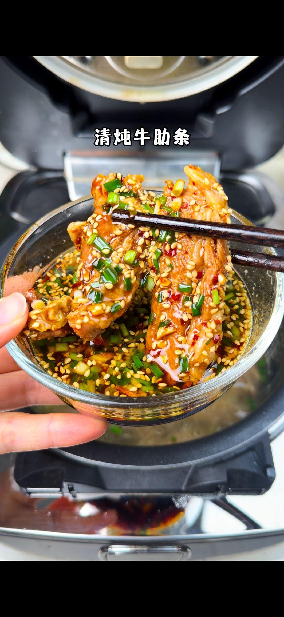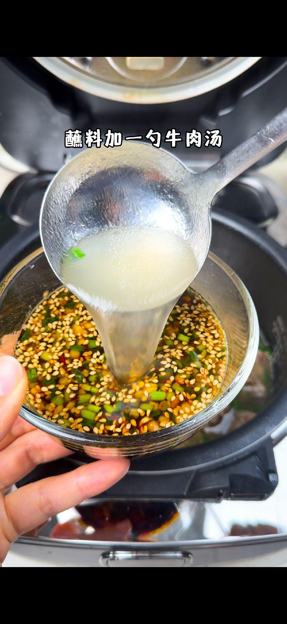 3️⃣出锅调味:开盖时牛肉香直接满屋飘!撒上葱花,蘸料加一勺牛肉汤,香嫩软烂的牛肋条直接开吃,比外面餐馆做的还入味~