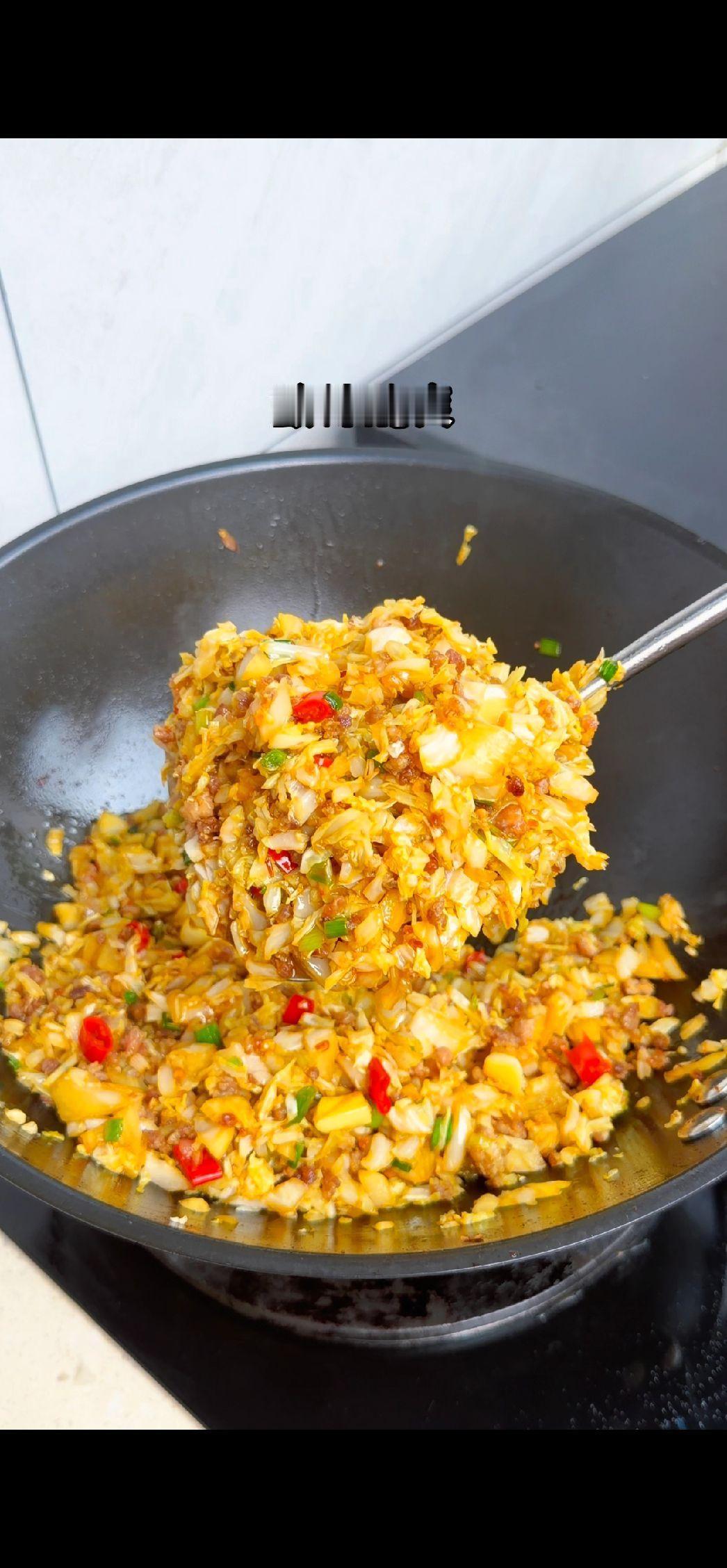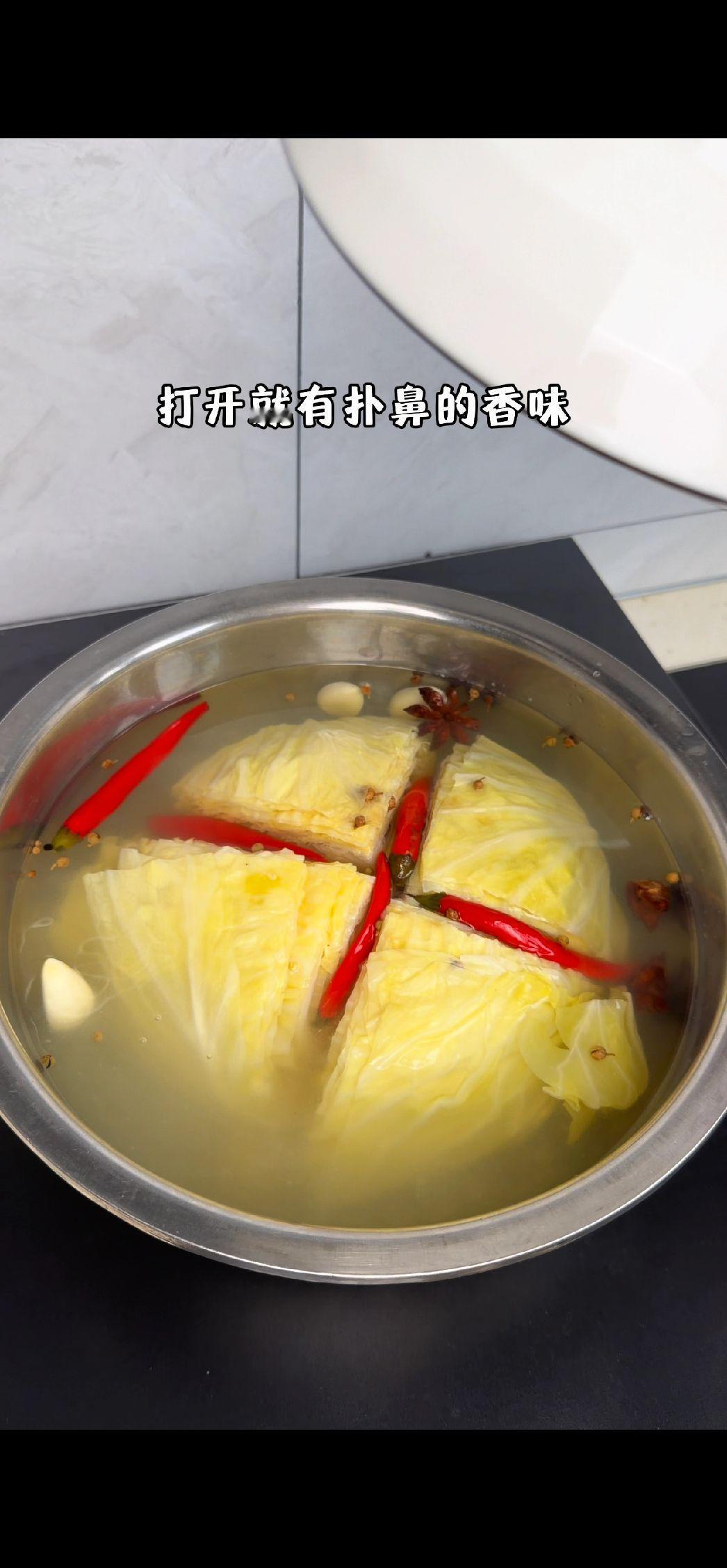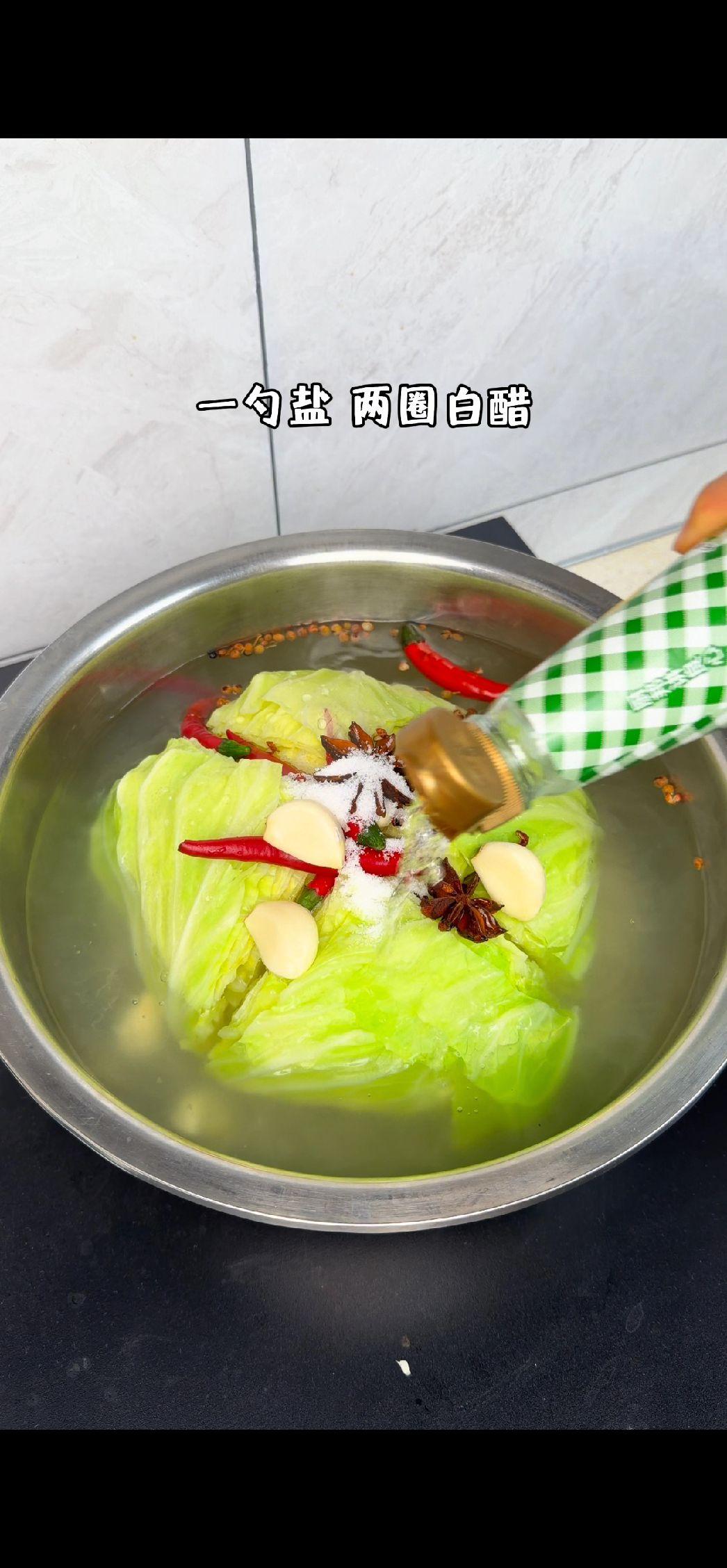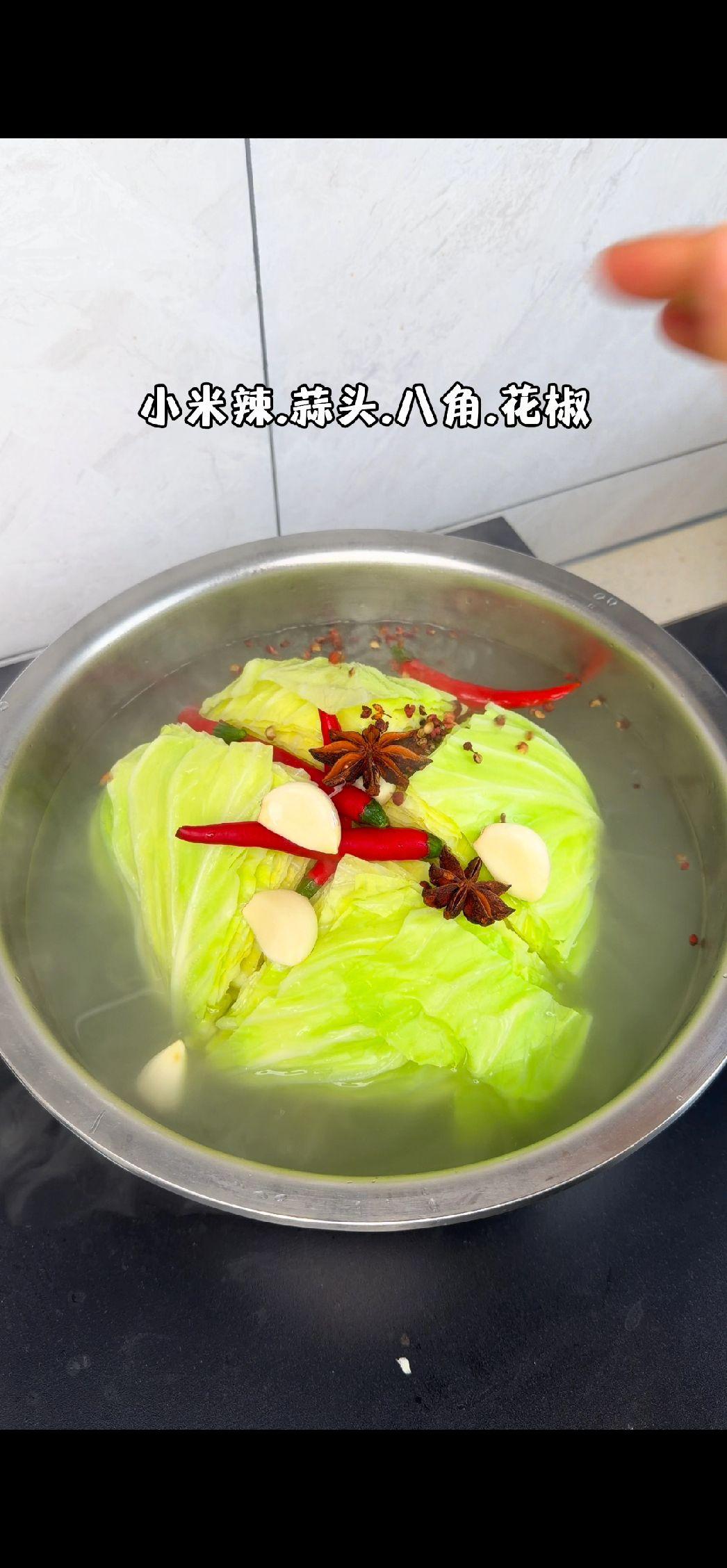 🍃包菜新吃法,酸辣脆爽超下饭!洗净的包菜切成合适大小,倒入滚烫的淘米水,水量要没过包菜哦。接着加入提前准备好的小米辣、蒜头、八角和花椒增添风味。