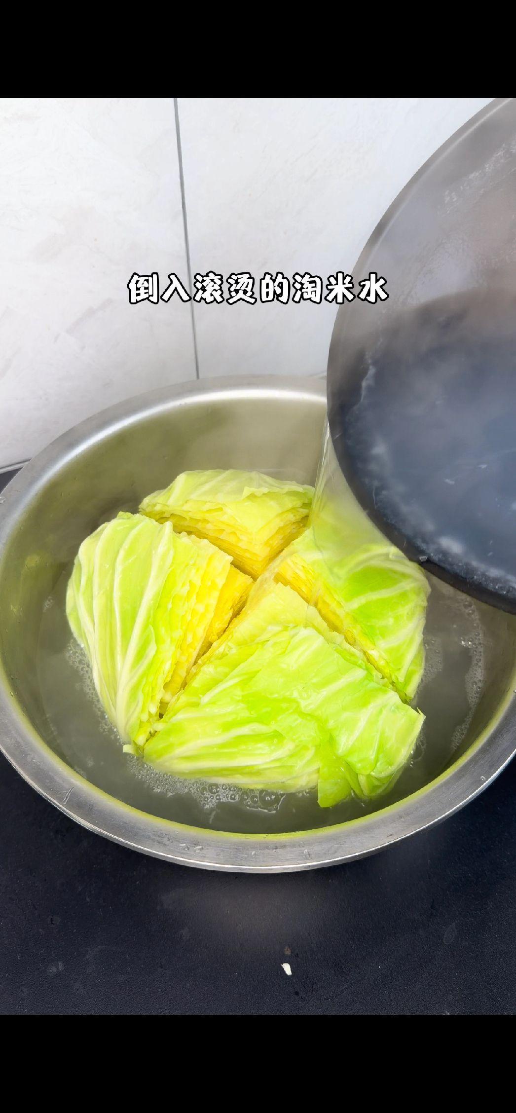 🍃包菜新吃法,酸辣脆爽超下饭!洗净的包菜切成合适大小,倒入滚烫的淘米水,水量要