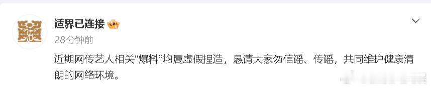 于适对接否认因私联退团于适对接否认退团传闻 近日,曝于适退团内幕:“出现私联粉丝的现象,就被公司退团了。”随后,于适对接否认退团传闻:近期网传艺人相关“爆料”均属虚假捏造,恳请大家勿信谣、传谣,共同维护健康清朗的网络环境。