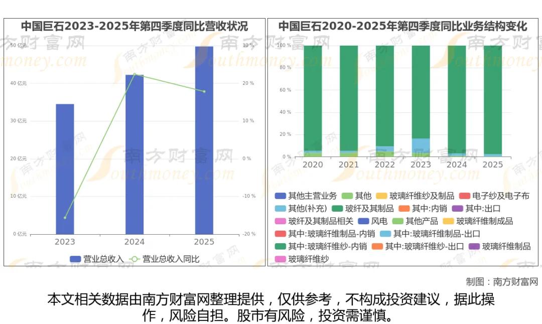 产能规模全球第一的玻璃纤维生产企业。产品线涵盖玻璃纤维及制品等产品,广泛应用于玻璃玻纤、风能、新材料等领域。2025年第四季度,主营业务收入49.77亿元,同比增长17.83%;净利润7.17亿,同比增长-21.32%;毛利润17.45亿,毛利率35.06%。
