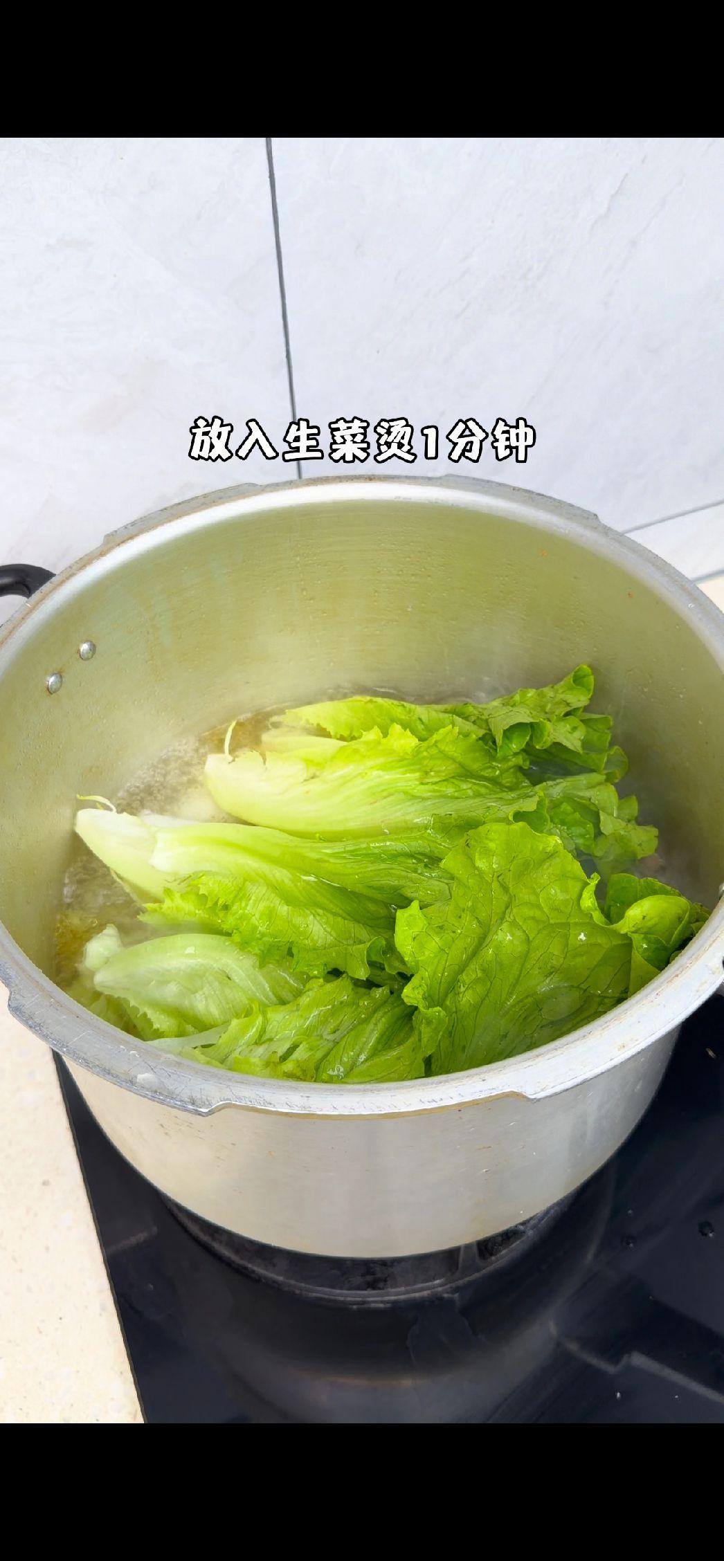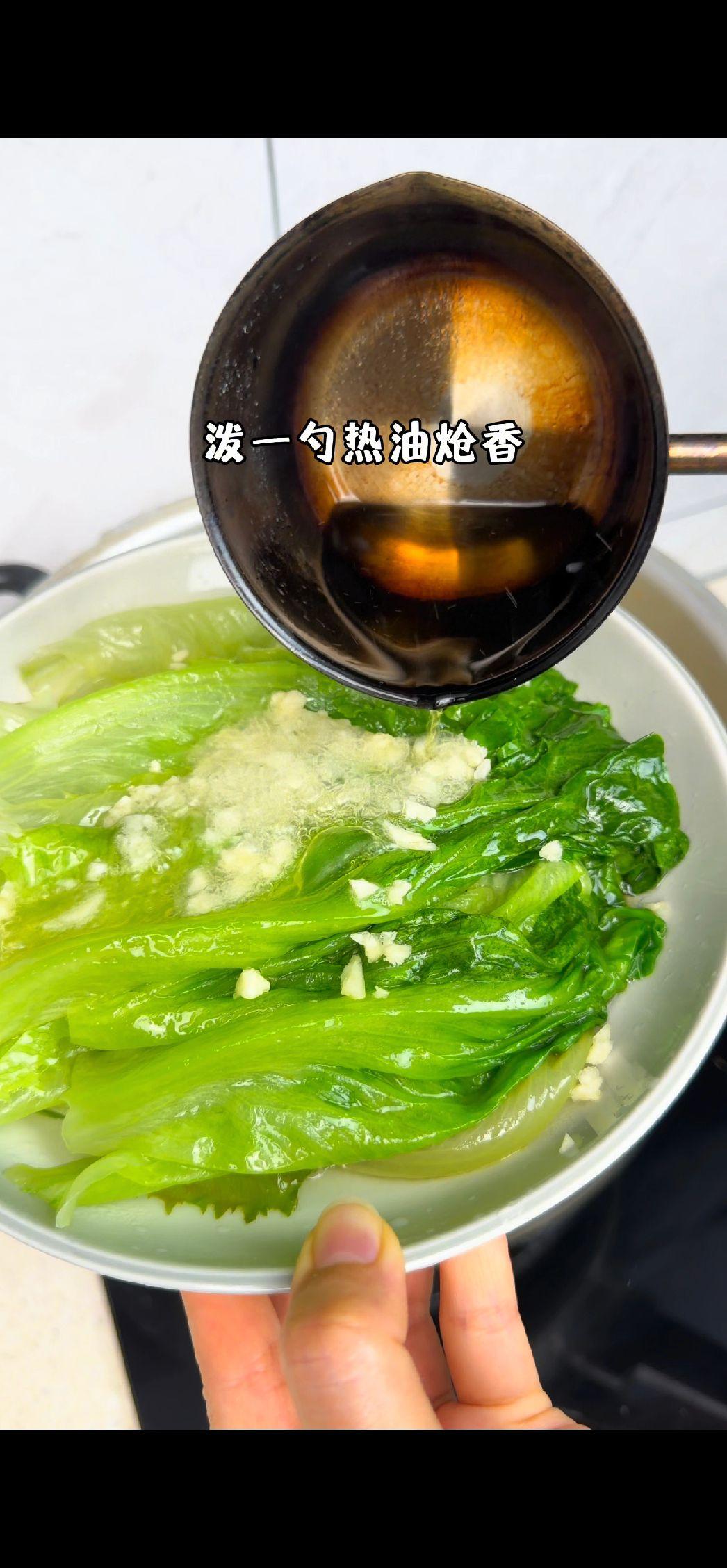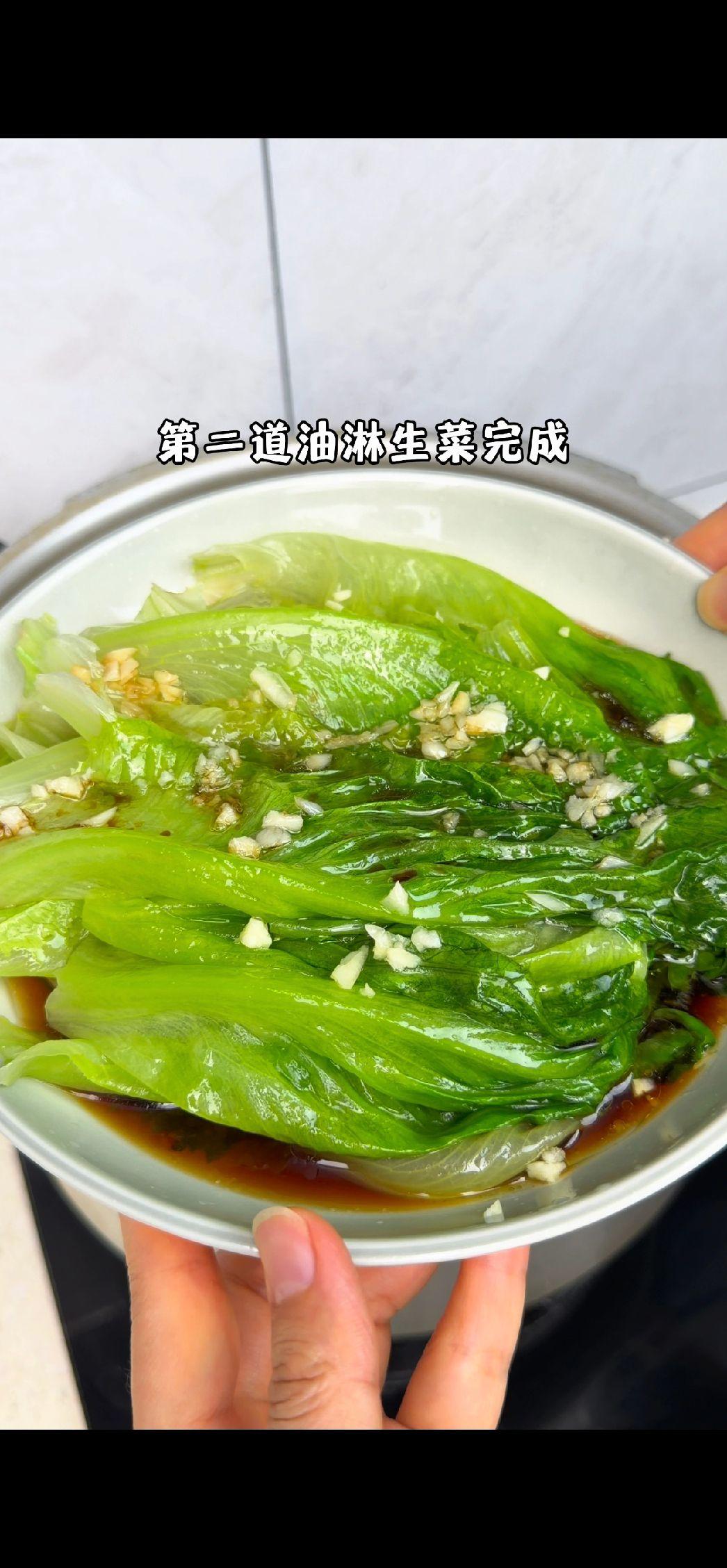 2️⃣做油淋生菜:萝卜剪小块,生菜烫1分钟,蒜末加热油炝香,淋蒸鱼豉油,再加一勺汤,第二道油淋生菜清爽可口~
