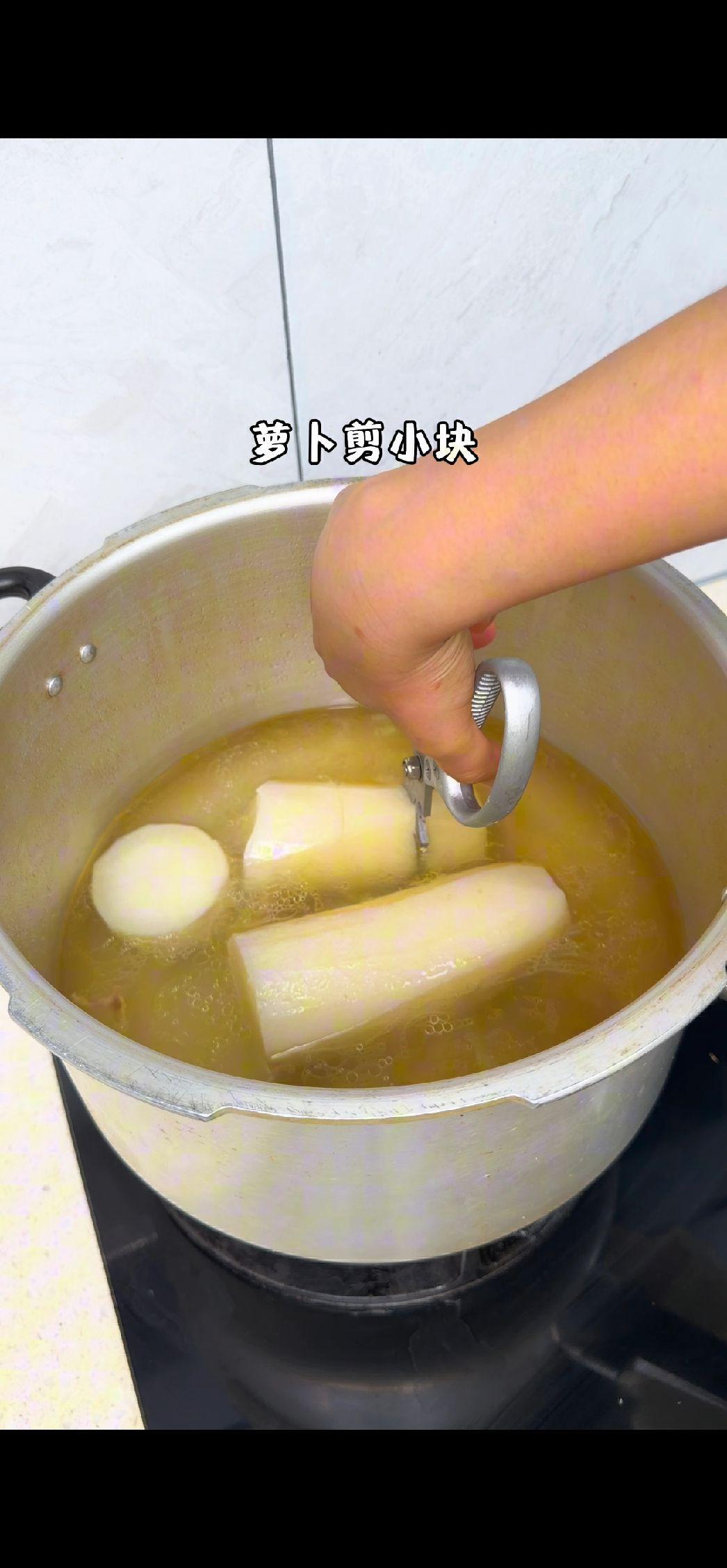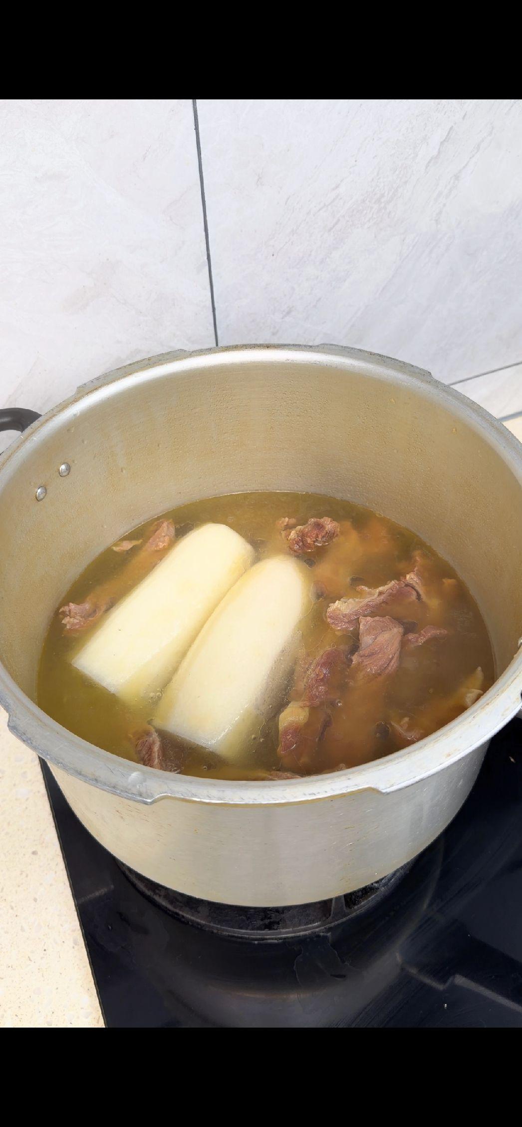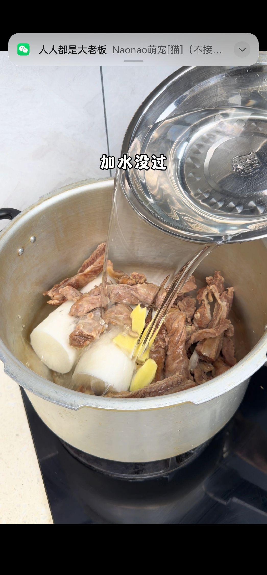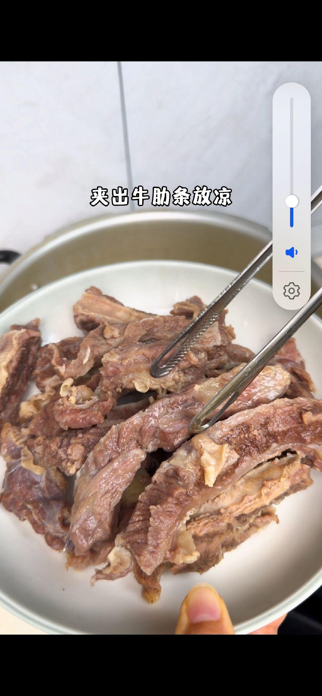 1️⃣处理牛肋条:白萝卜放入高压锅,倒入焯水的牛肋条,加三片姜去腥味,冷水没过,高压锅上气压12分钟,自然冷却后捞出来,第一道菜牛肋条就完成了,切片沾酱超香~