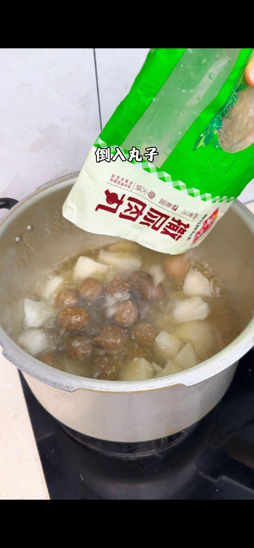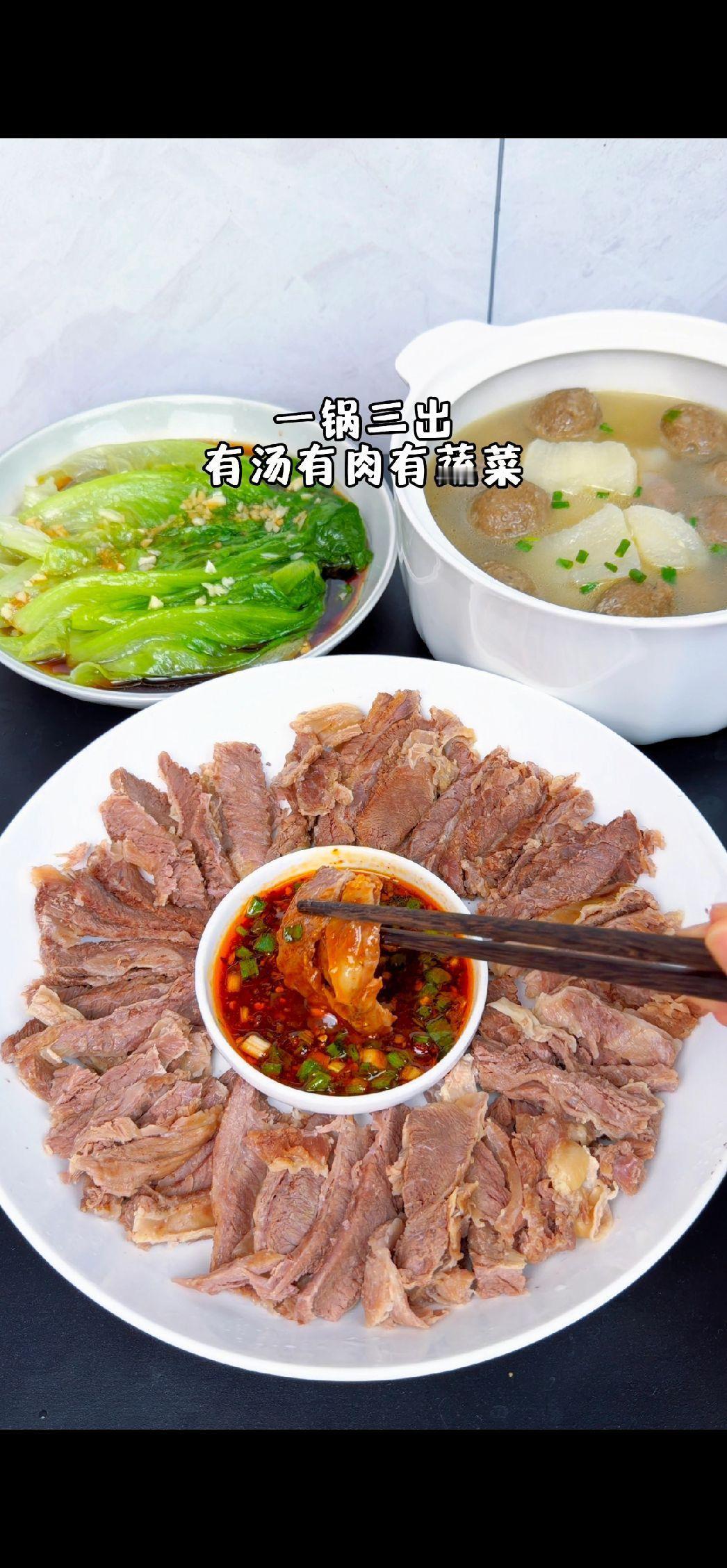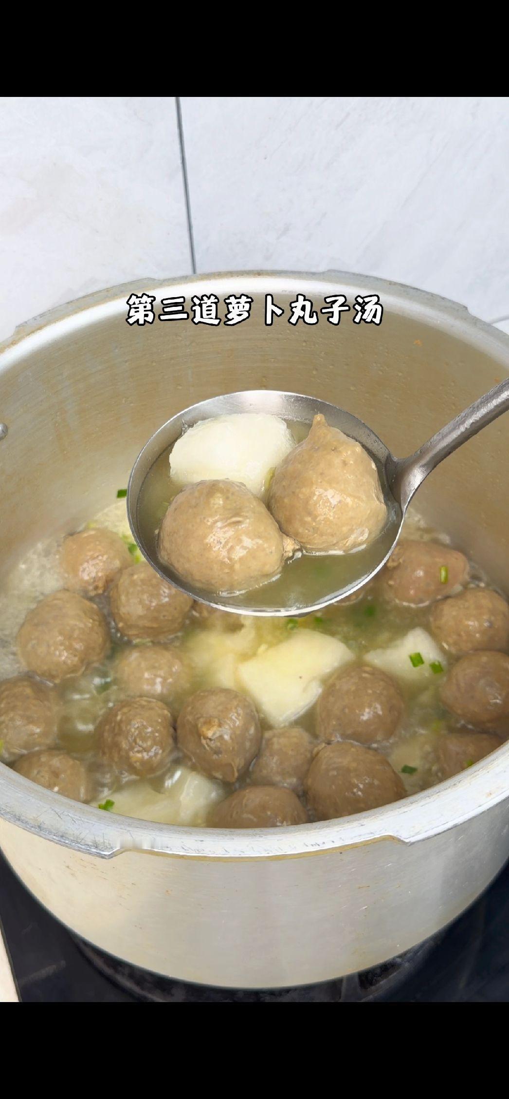 3️⃣熬萝卜丸子汤:倒入丸子,加盐调味,撒一把葱花,第三道萝卜丸子汤就出锅啦!一锅三出,有汤有肉有蔬菜,简单又方便~
