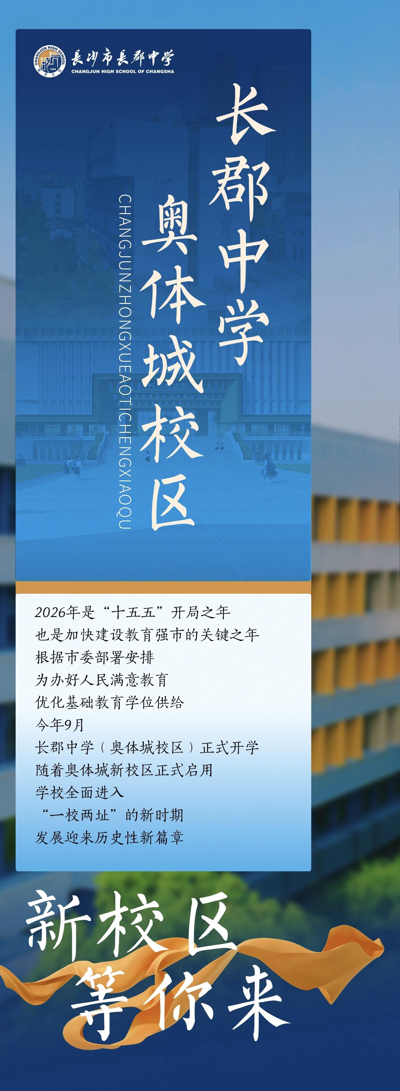 百廿长郡,历久弥新。奥体城校区的启用,既是长郡办学精神的延续与传承,也是其对接城市发展战略、探索未来教育模式的全新实践。2026年金秋,这所兼具深厚文化底蕴与硬核办学实力的校园,将以全新的姿态迎接新生,用扎实的办学实力守护教育初心,在时代发展的新赛道上,续写长郡教育的全新篇章。