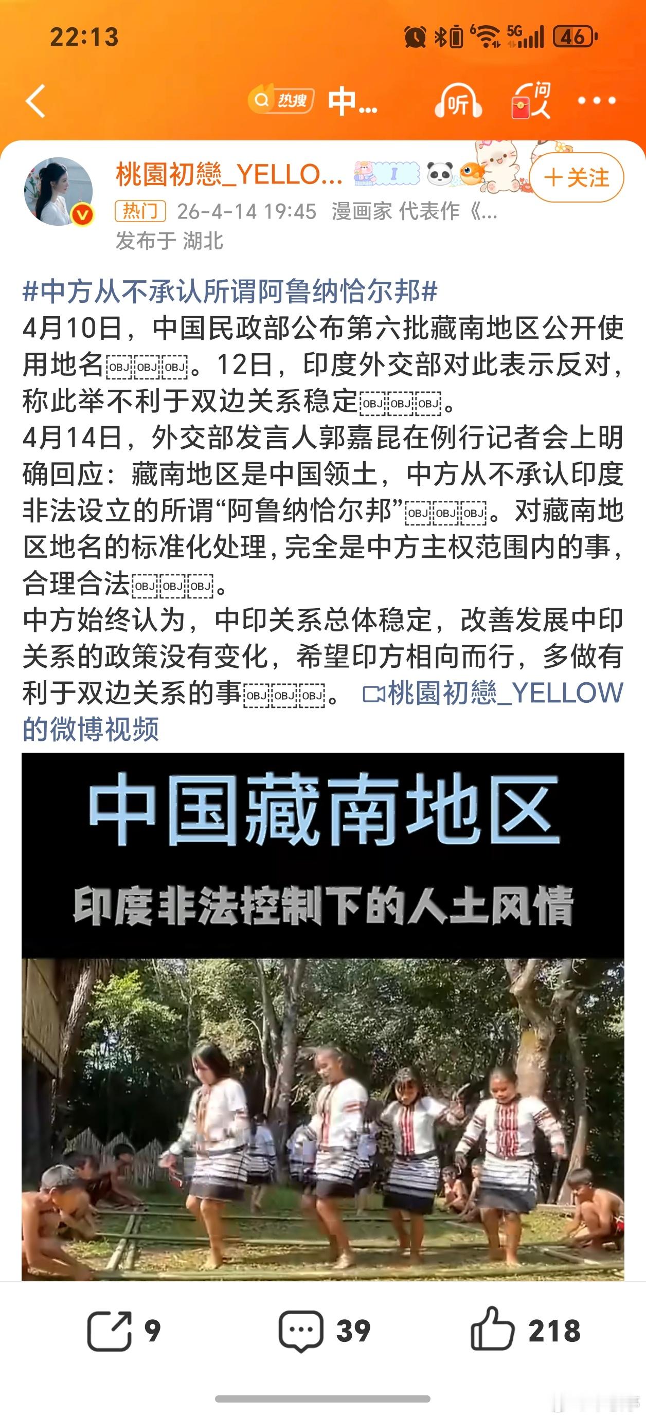 中方从不承认所谓阿鲁纳恰尔邦藏南约9万平方公里,约为台湾的2.5倍,确实是很大的面积。我国对藏南地区部分地名进行标准化处理,完全合理。