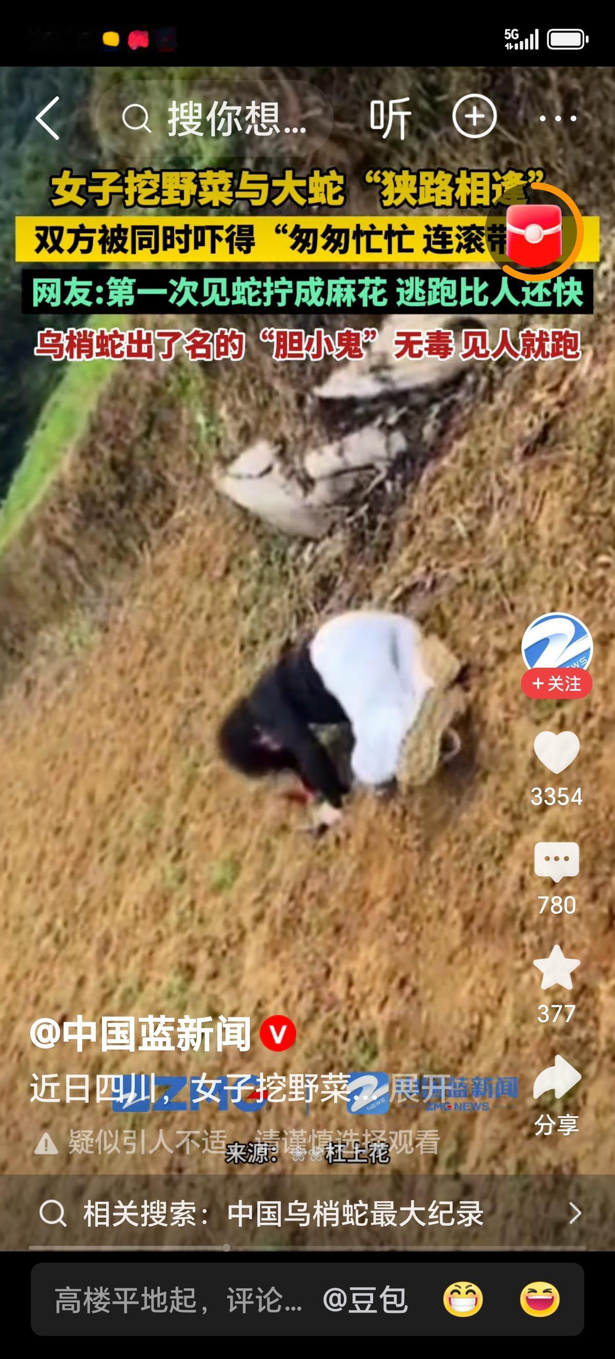 女子挖野菜挖到大蛇,双方都吓坏了:这才是普通人最真实的反应,笑喷又暖心!