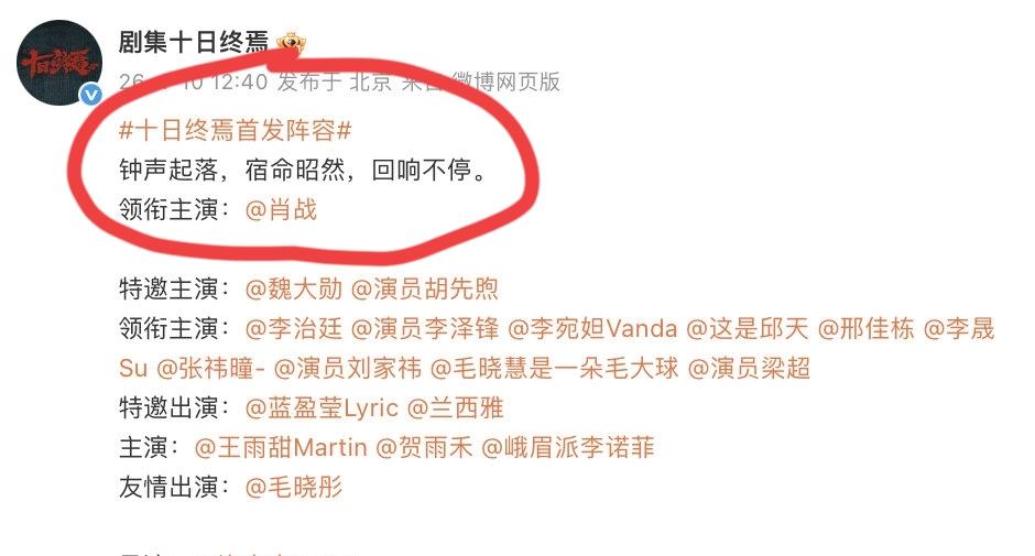 还有人问肖战现在什么咖位的 这么说吧,看看《十日终焉》的演员表就知道了。 好