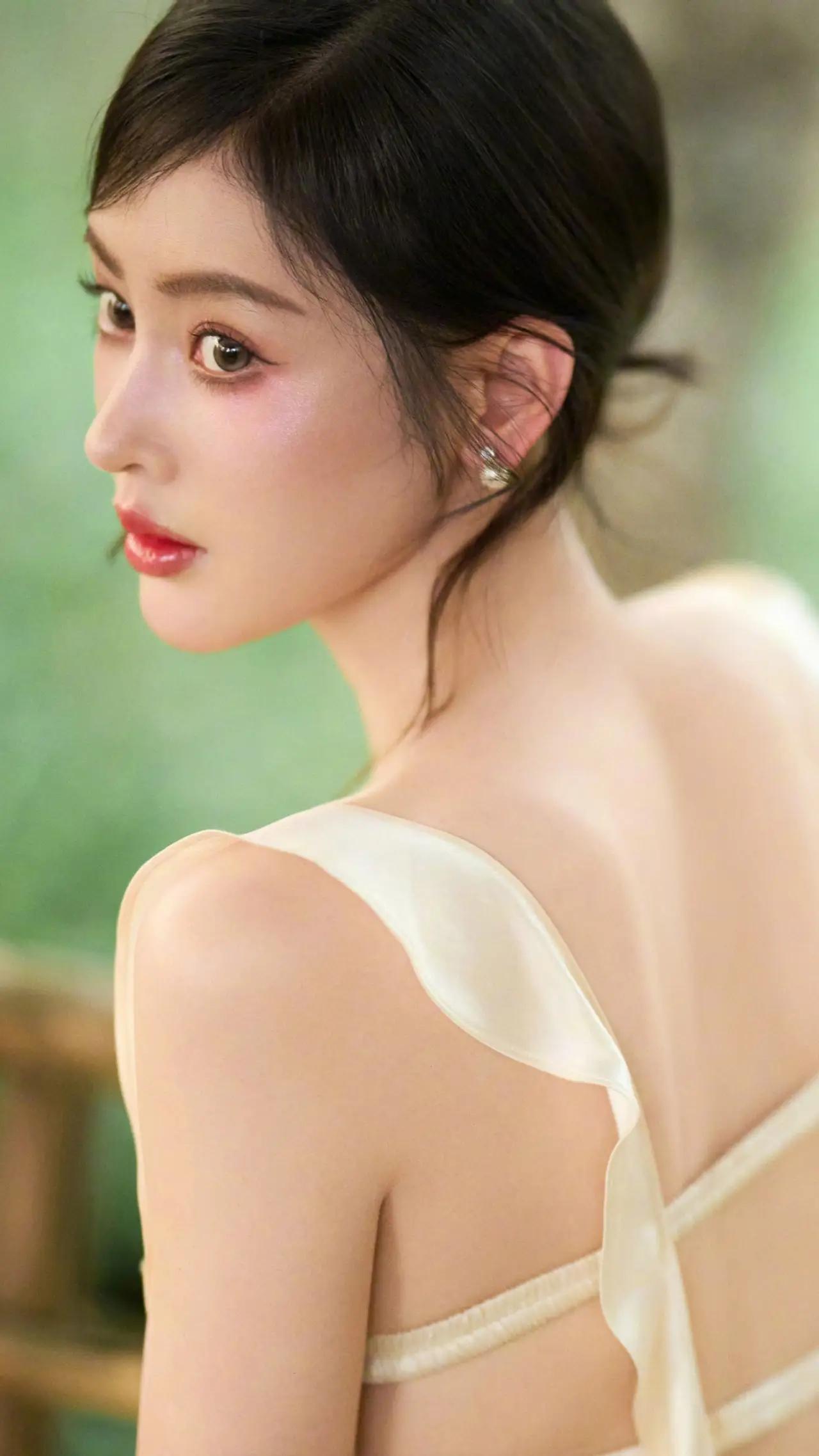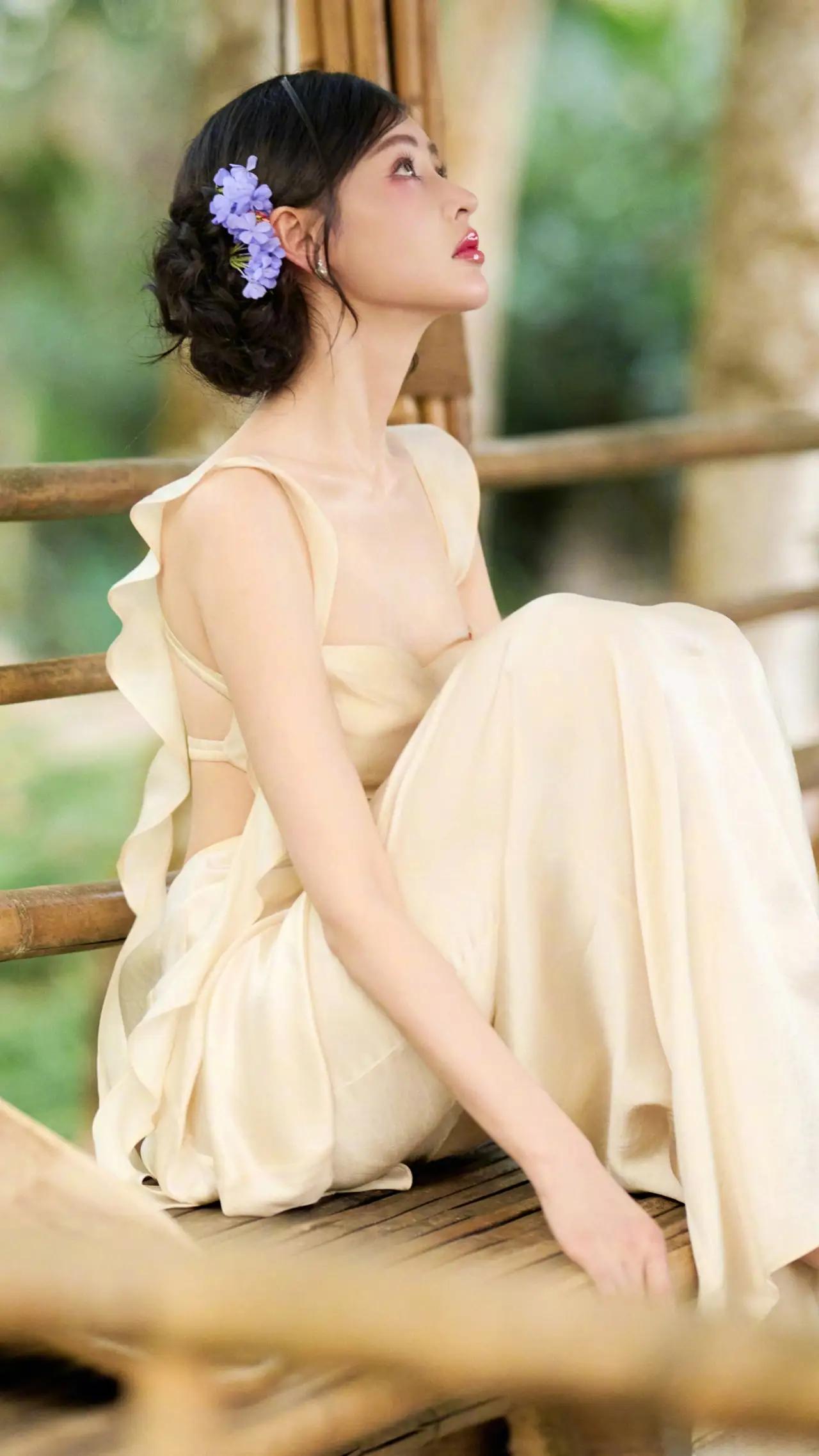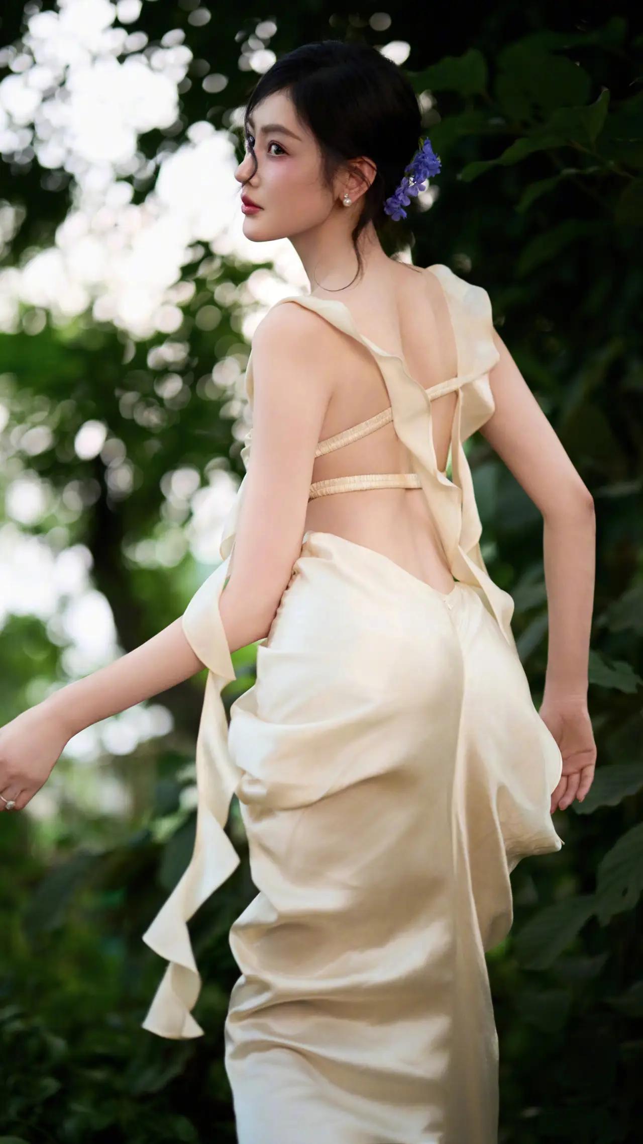 美女壁纸~张天爱,奶油色缎面长裙漫过林间绿意,发间别着淡紫花簇2026.4.15
