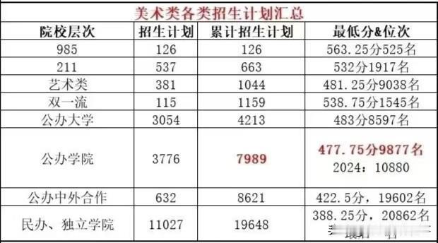 现在河北省美术与设计类综合成绩计算公式为:综合成绩=高考总成绩×0.5+(专业成绩/专业满分)×750×0.5,目前综合成绩孩子已经拿到了300分,现在就需要看文化成绩(高考总分)了。按照去年情况大致来看,如果不挑学校和专业,综合成绩480分以上,可以走公办本科;530分以上,211、双一流院校有机会。也就是说6月份高考能考360分以上,走本科还是问题不大的,想要学校层次更好,就需要高考成绩更高了,以此类推。