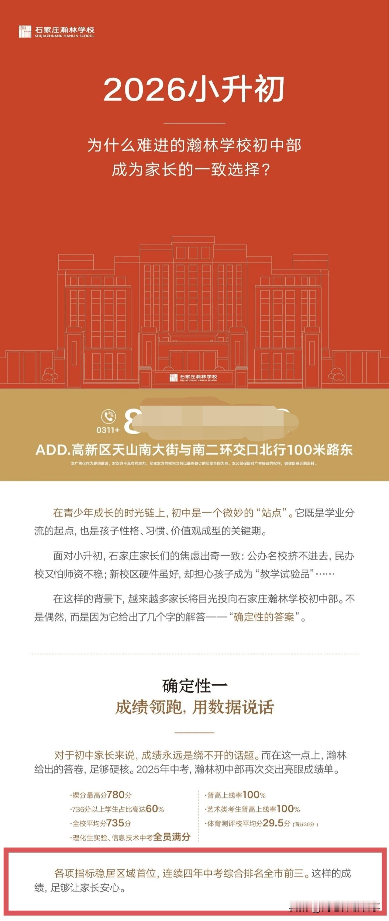 这个月底,石家庄初三全市一模考试将鸣锣开考,对于初三的学生来说,这是一场至关重要的考试,首先考试流程和时间完全按照中考标准;其次,一模成绩出来后,各高中的“抢人大战”也将陆续开始。中考的“战场”暗流涌动,实际上小升初的“战役”也在稳步推进,就在前几天,接连在朋友圈刷到了石家庄瀚林学校的广告,紧接着又在某平台上刷到不止一位网友发的宣传手册,如此大规模的广告投放力度,不禁让人为学校的“超能力”折服。当然,更令人惊叹的是其中提到的学校的中考成绩:2025年中考最高分780分、全校平均分735、736分以上学生占比60%、普高上线率100%、连续四年中考综合排名全市前三……