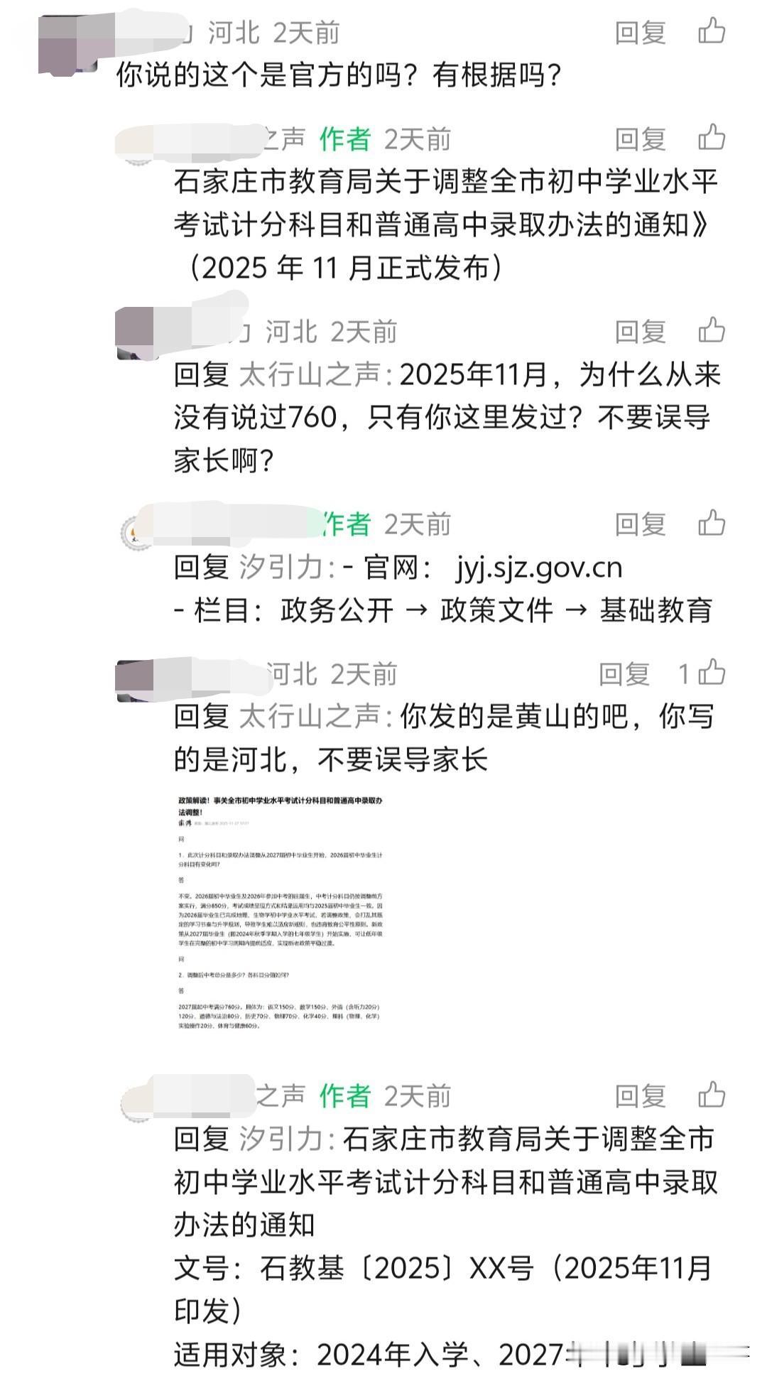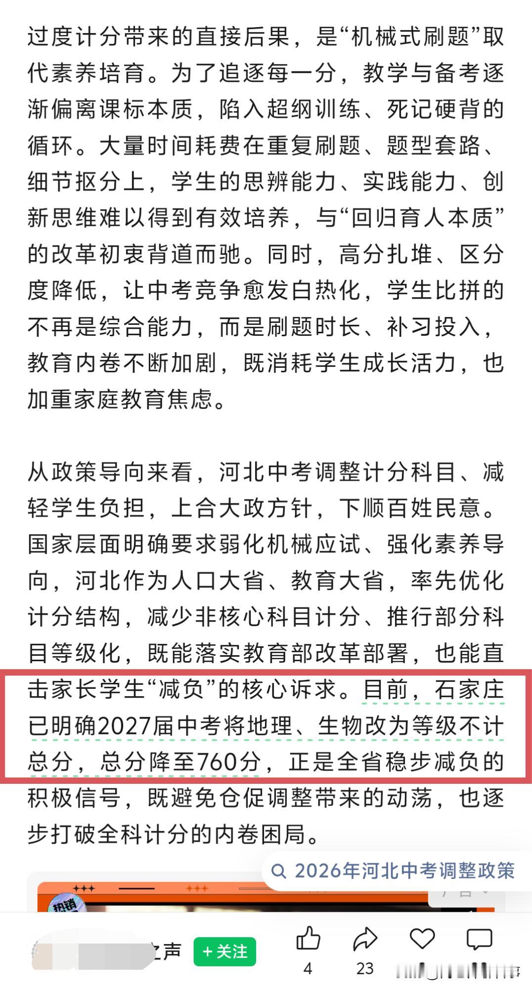 这一阵,河北地理生物小中考吵的又比较厉害,原因在于前一阵全国多地进行了中考调整,生物地理不再计入中考总分。这一下又点燃了家长们的“怒火”,吐槽、抱怨之声不断。就在这两天,我也偶然刷到了一篇文章,作者在文中赫然提到“目前,石家庄已明确2027届中考将地理、生物改为等级不计总分,总分降至760分”。起初看到时我也甚是欣喜,以为作者得到了权威消息,和很多读者一样,迫切想知道消息来源。顺势下滑评论区,面对其他网友的提问,作者不仅指出了文件出处、查询渠道,还详细解读了总分760分的构成,让人误以为作者所言是千真万确。但稍加思索,便可看出漏洞百出。