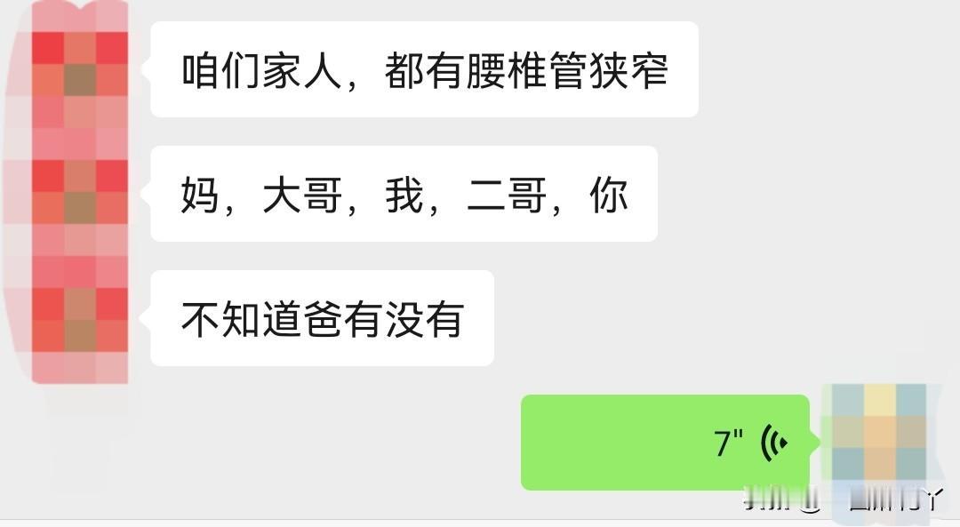 我姐姐说:咱妈,咱大哥、二哥,我,都有腰椎管狭窄,看来是天生的。人家的腰椎管都是4车道,有的人还是8车道,咱们可倒好,两车道。能不动不动塞车吗?