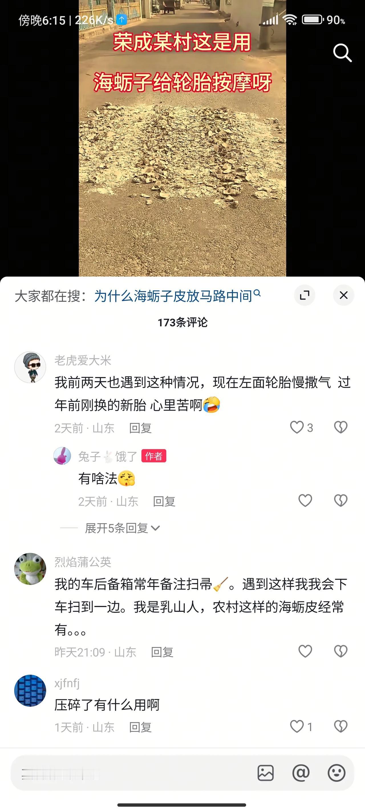 这些海蛎子壳被车压了之后变成粉末,然后老百姓就把这个粉末喂给鸡,然后鸡蛋壳都会长得比较有劲。造成的后果就是很多车胎会被扎,你怎么看?