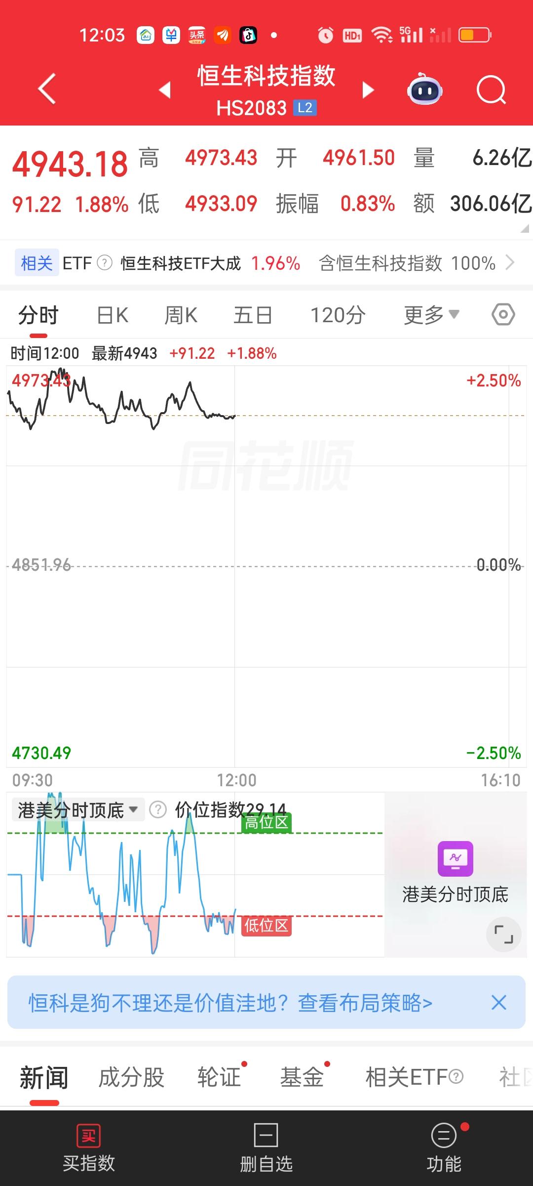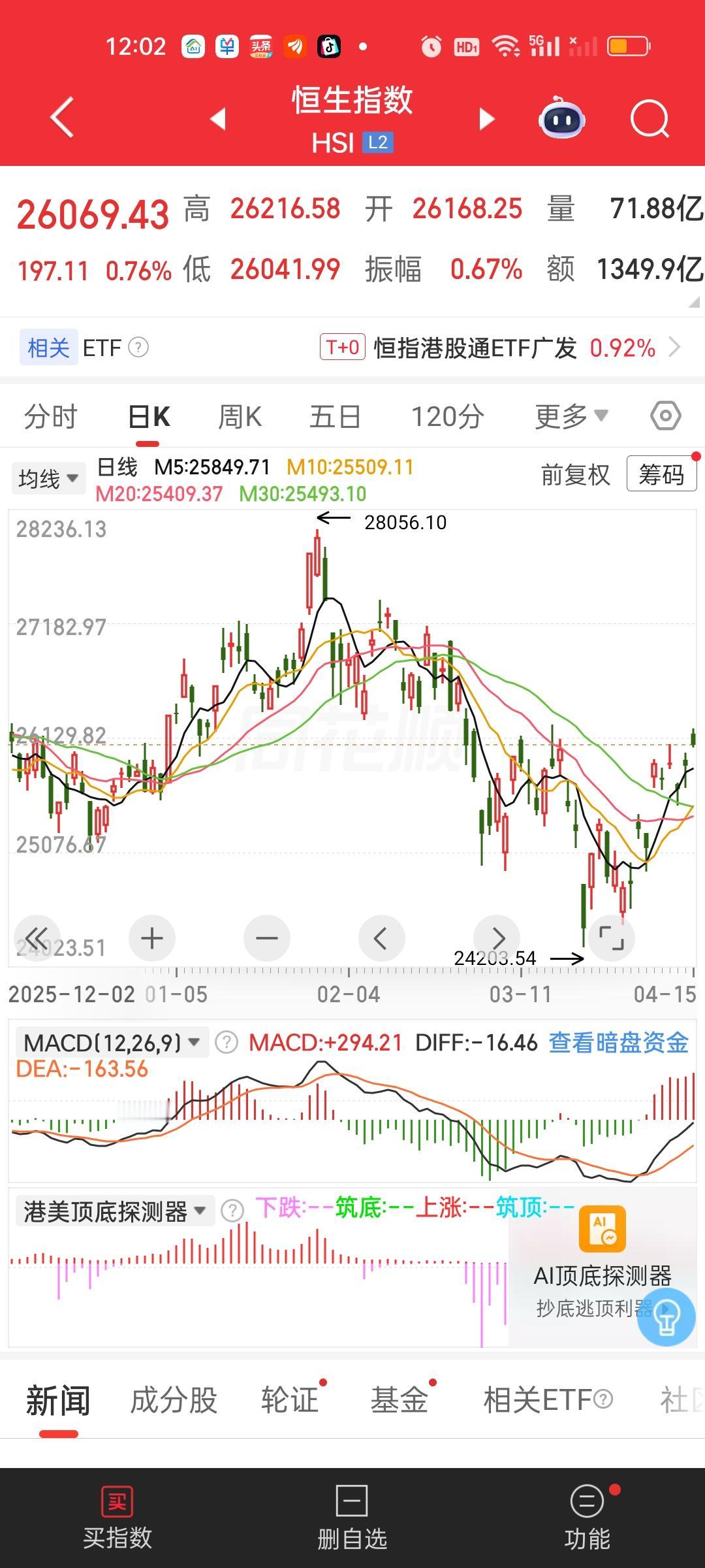 港股今天的表现还不错,恒指已经连续几个交易日站上全部均线上方了,恒科一直被压制,今天一鼓作气也成功站上所有均线上方了。但你说这个地方就一定不会再下来了,那也说不好。但这个位置风险肯定没有那么大,再磨一磨也很正常!