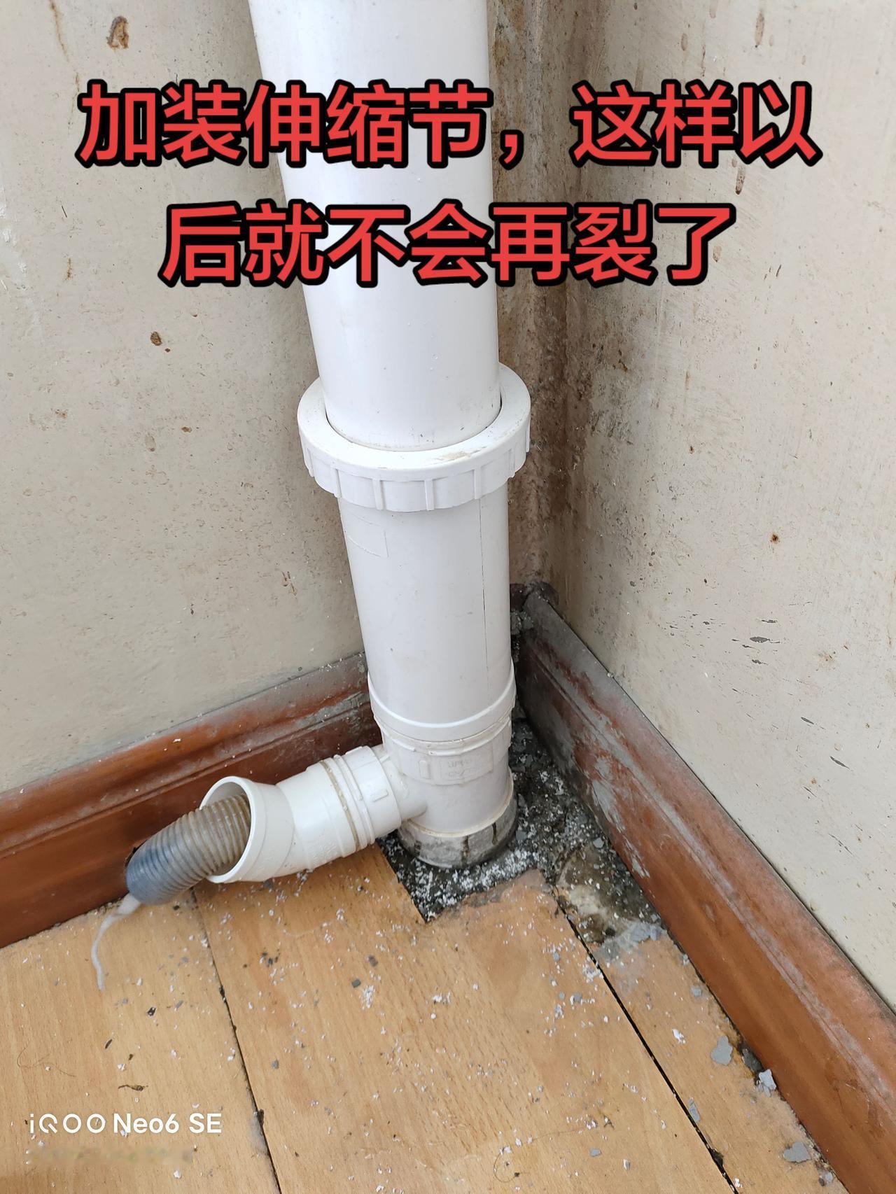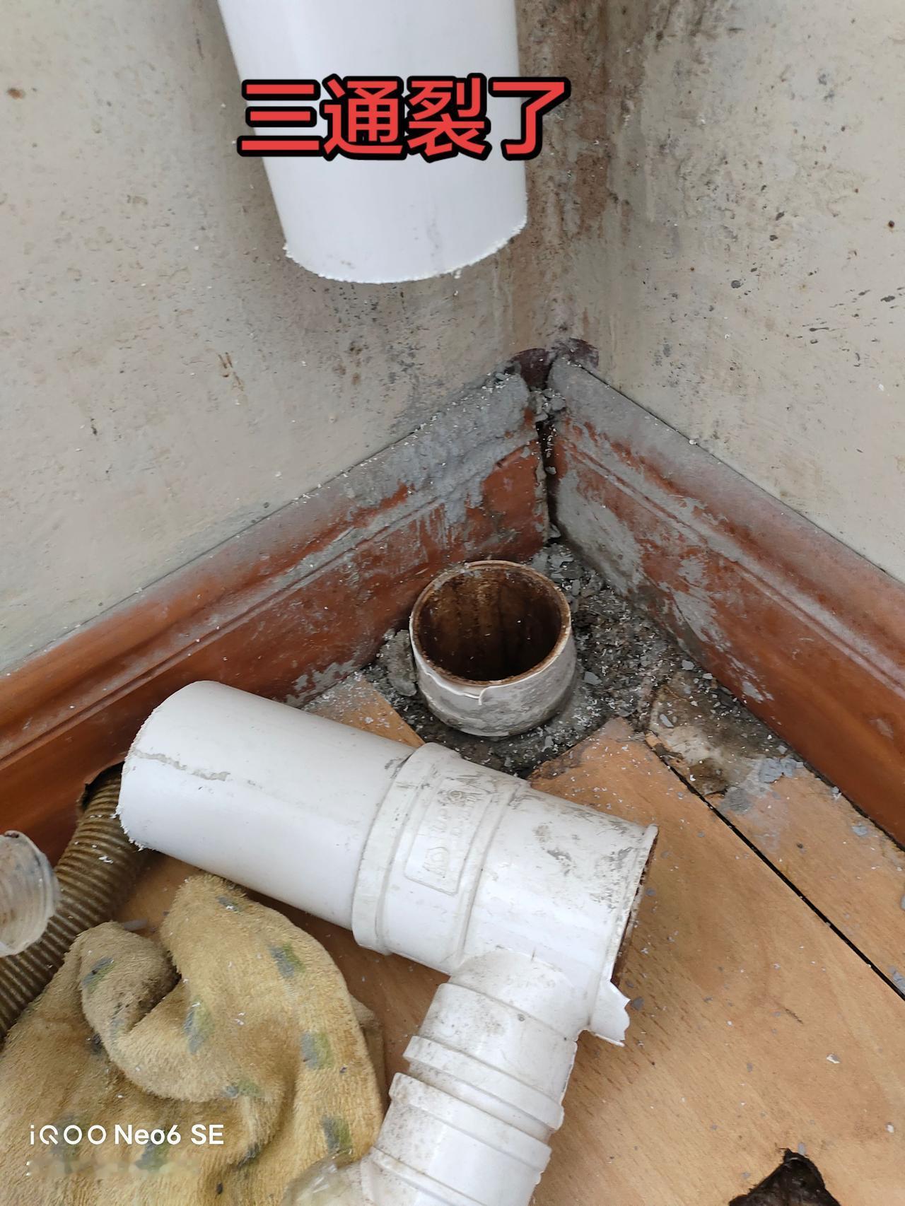 楼下时不时有积水,因为下水管包起来了,没法检查,问楼上,楼上说不漏。 陈楼上在家的时候检查。发现三通破裂,地板都泡了