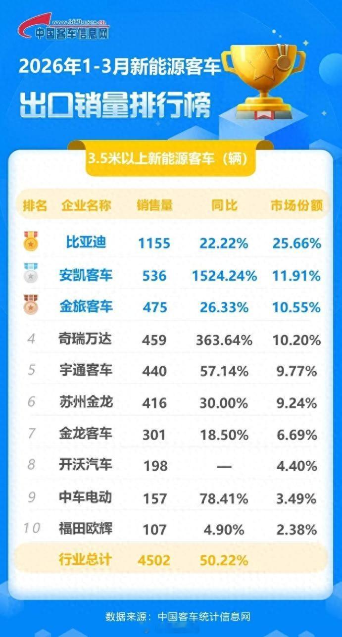 据中国客车信息网数据显示,2026年3月,比亚迪新能源客车出口再次位列第一,同比增速21.52%。至此,一季度,比亚迪新能源客车总出口1155辆,市场份额25.66%,稳居榜首;是行业唯一出口新能源客车超过1000辆的企业,也已连续三年蝉联新能源客车出口冠军。