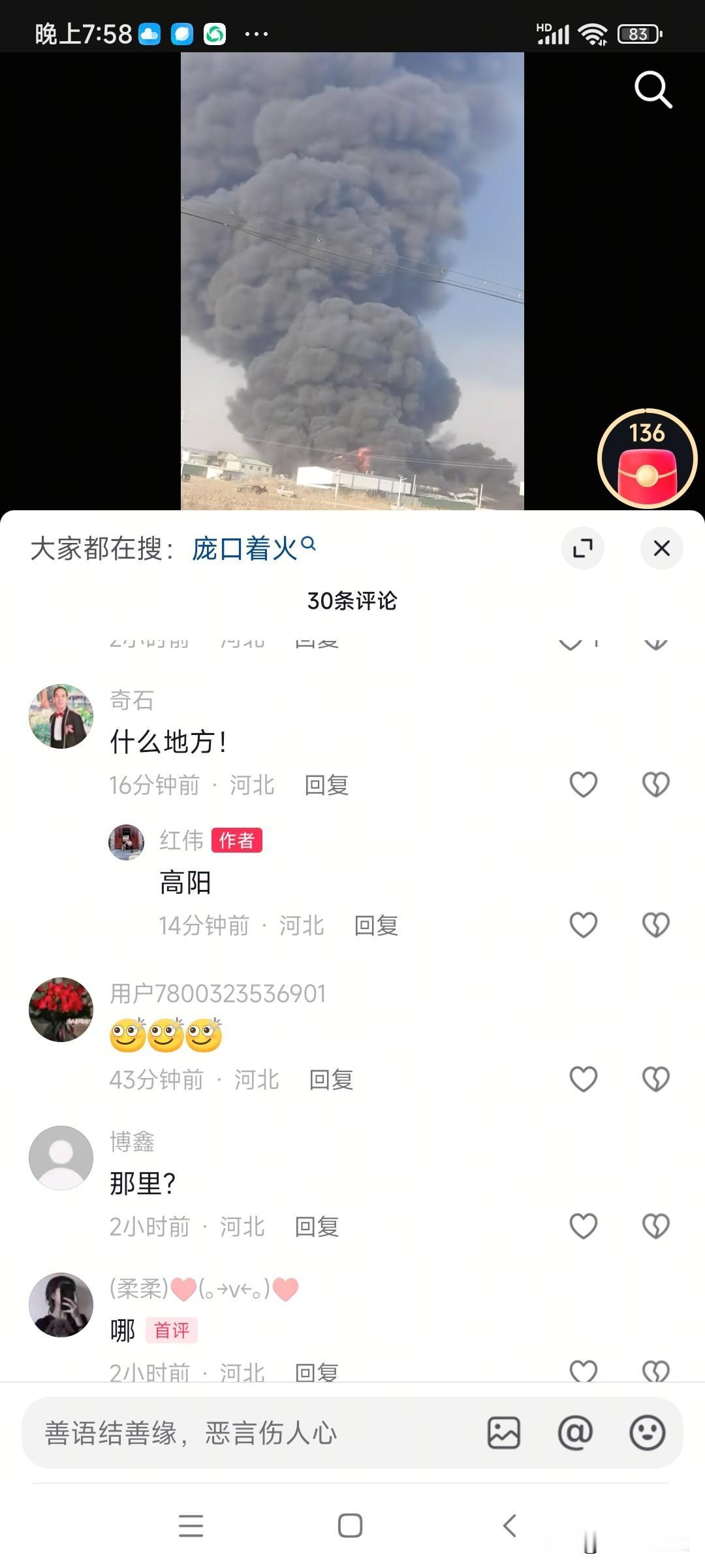 保定市高阳县庞口镇陈庄工业区发生火灾,具体失火原因及损失待当地官方通报。