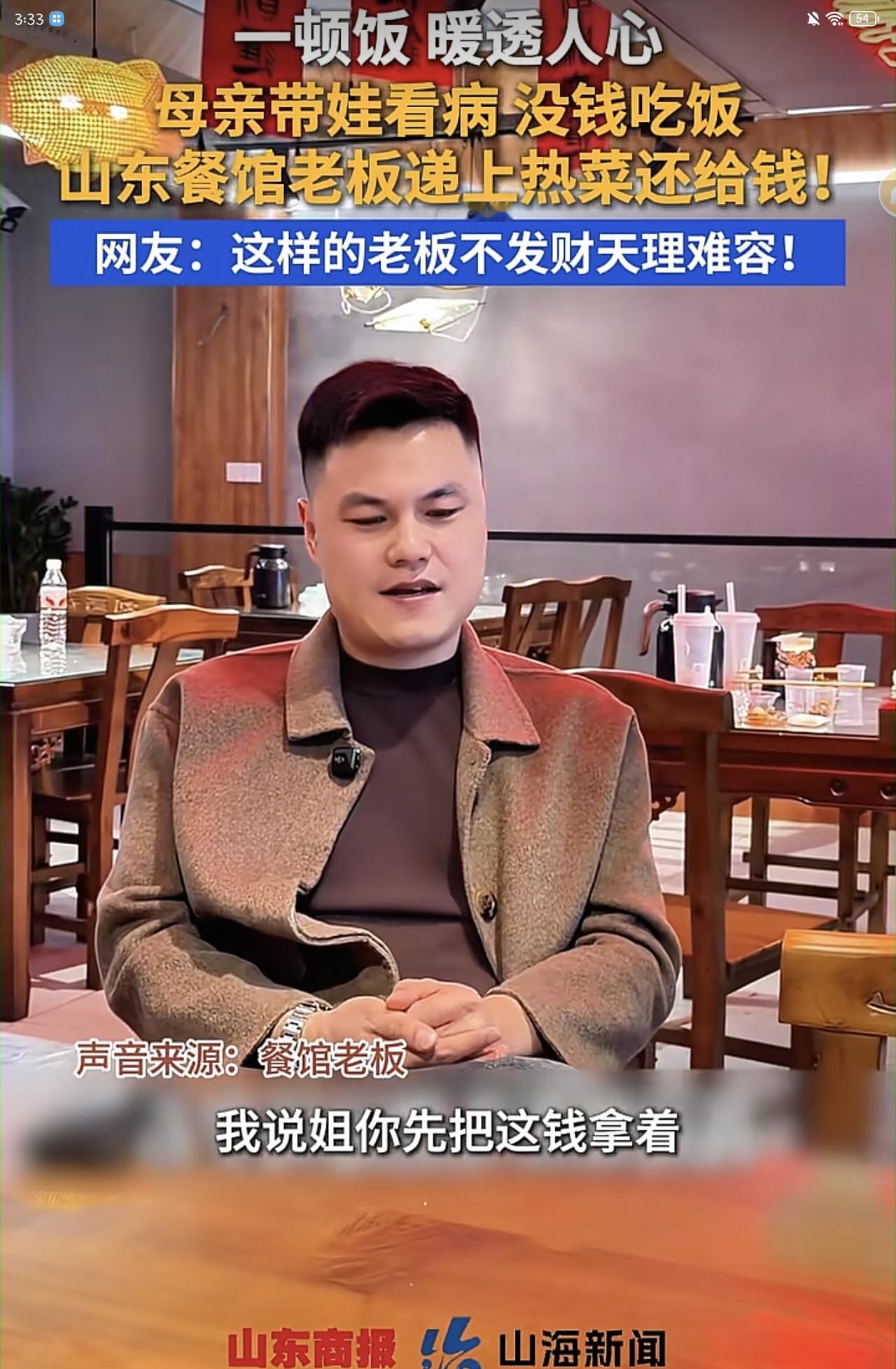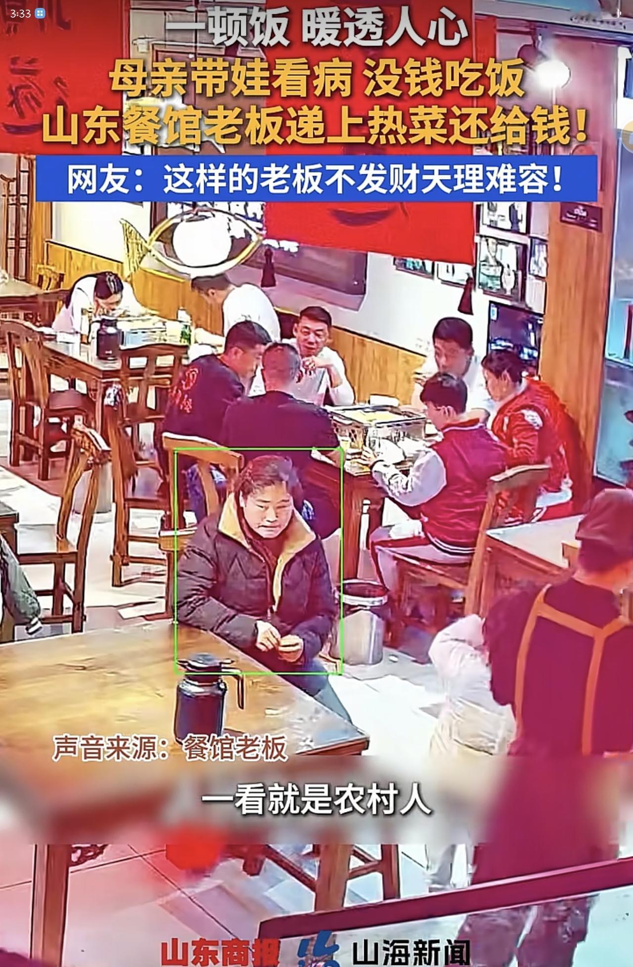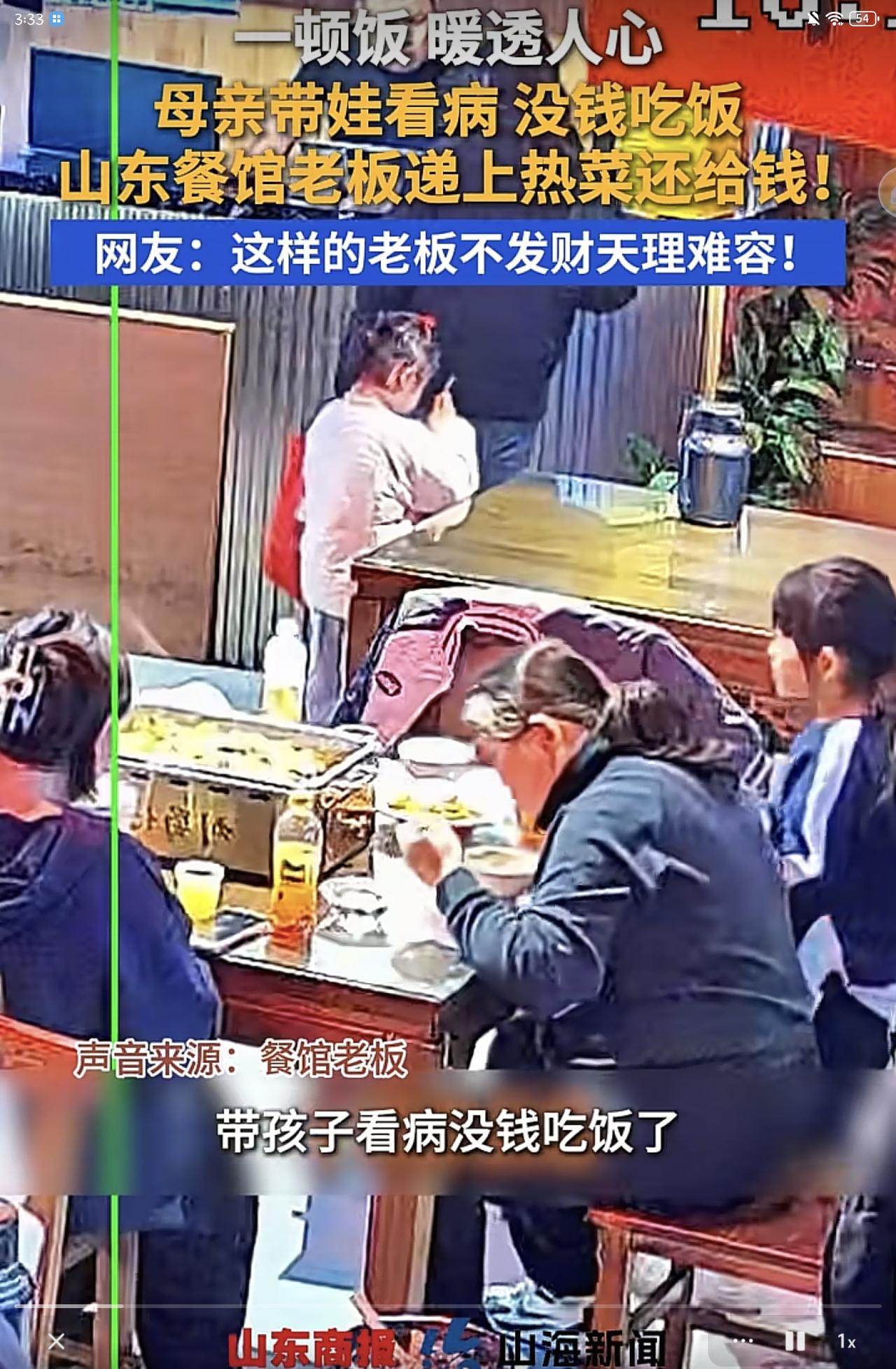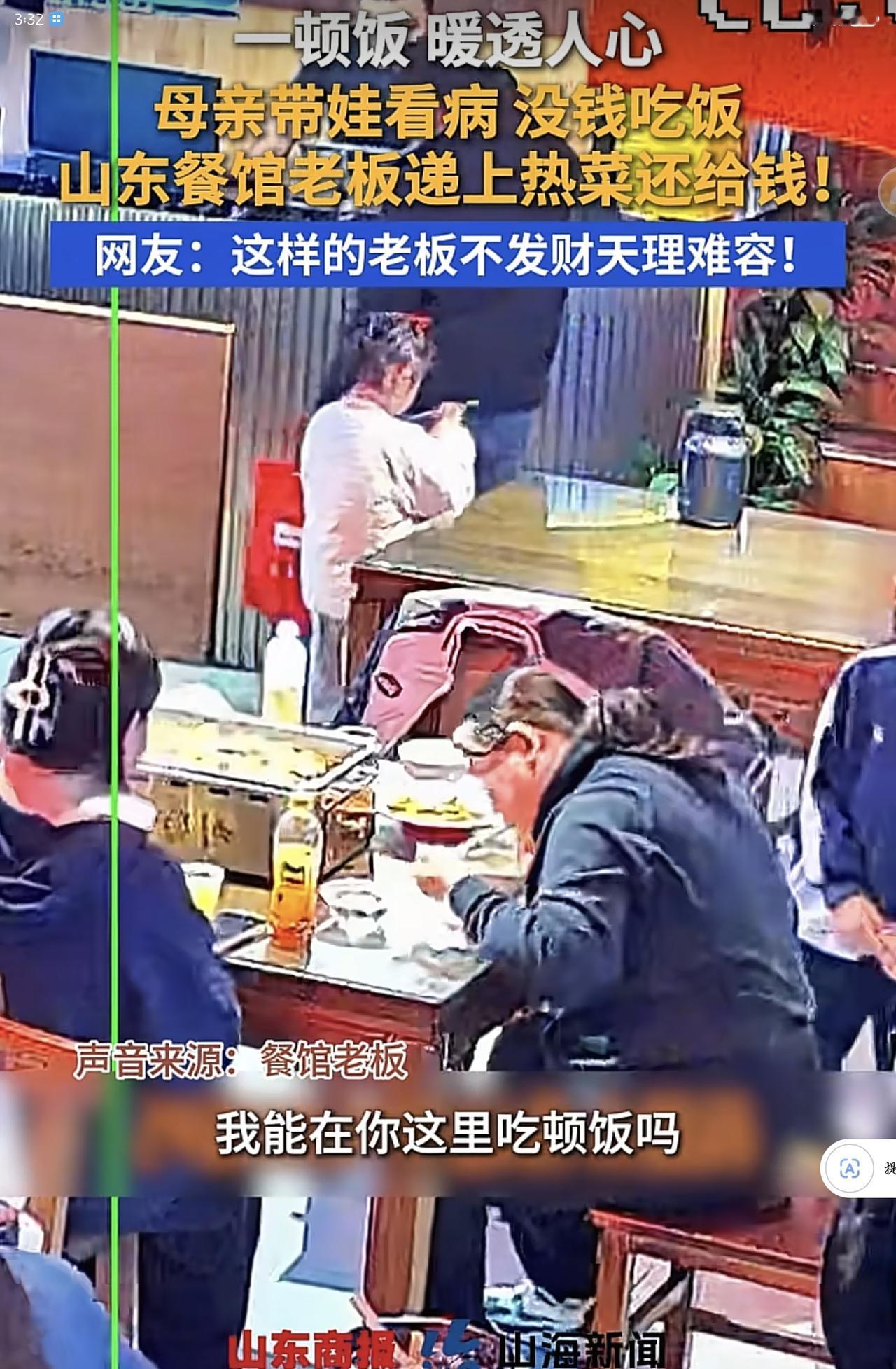 活该发财!近日,山东临沂一家家常菜馆里,发生了一件特别暖心的事。餐馆老板正忙着打理店里的事,一位带着孩子的女人推门走了进来,女人支支吾吾、声音特别小地问:“我带孩子来看病,身上实在没钱吃饭了,能不能在你这吃顿饭?”老板一开始听了也愣了,可他接下来的做法,让这个女人当场就红了眼。