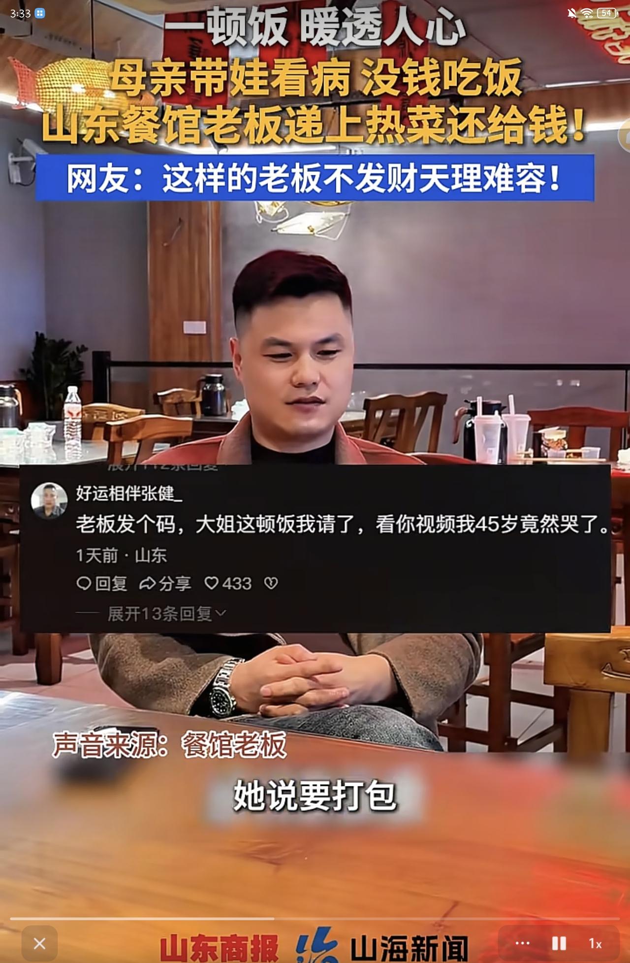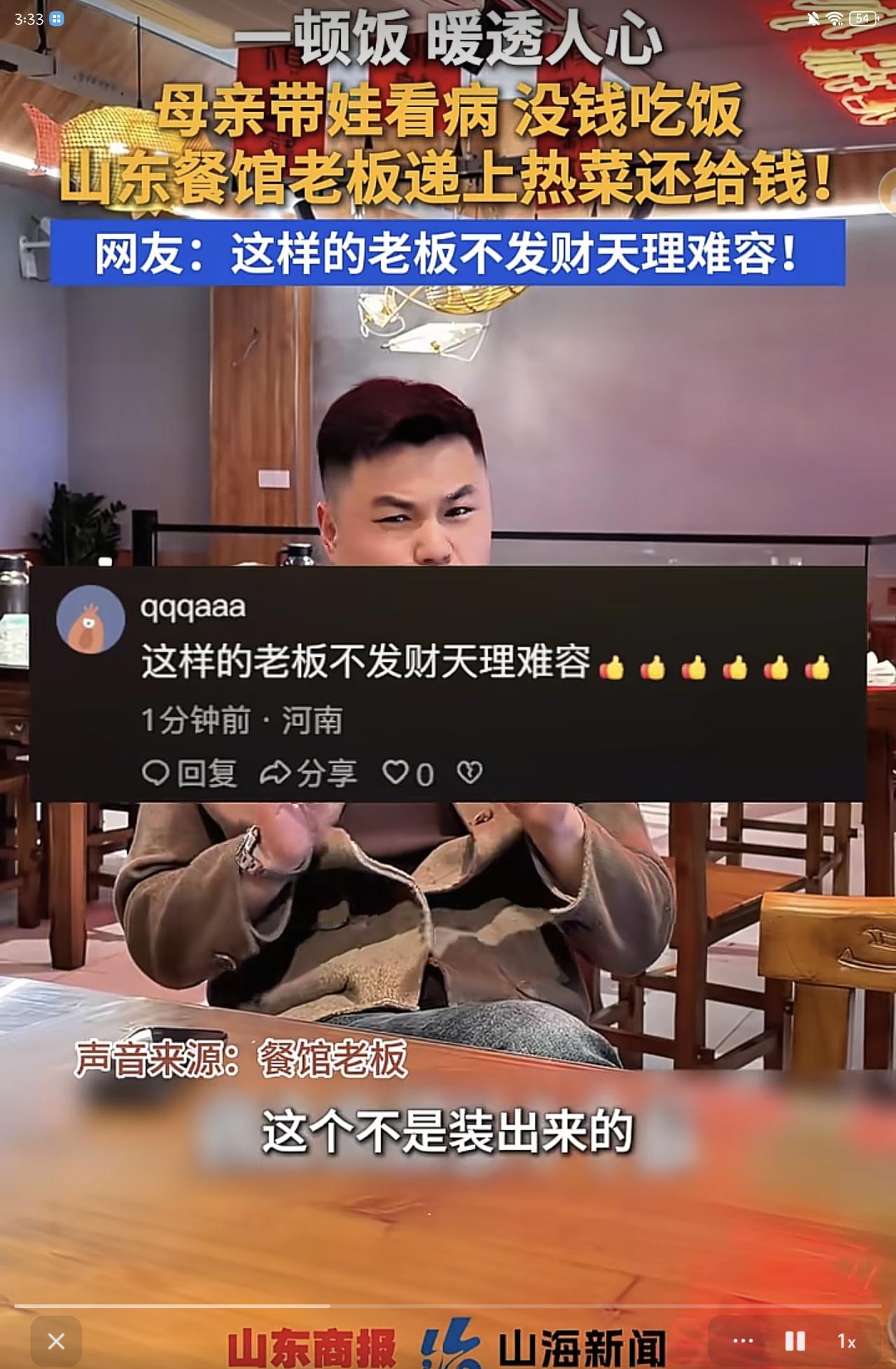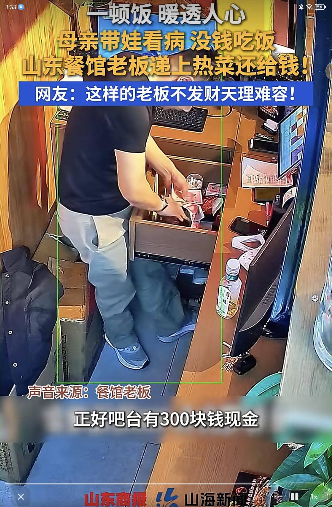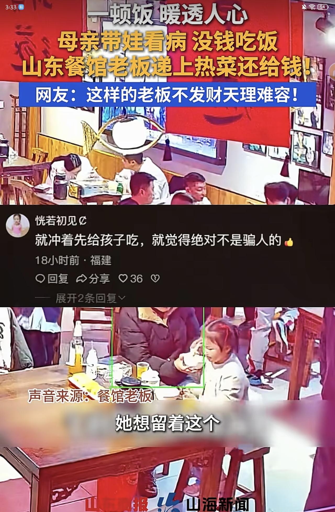 活该发财!近日,山东临沂一家家常菜馆里,发生了一件特别暖心的事。餐馆老板正忙着打理店里的事,一位带着孩子的女人推门走了进来,女人支支吾吾、声音特别小地问:“我带孩子来看病,身上实在没钱吃饭了,能不能在你这吃顿饭?”老板一开始听了也愣了,可他接下来的做法,让这个女人当场就红了眼。