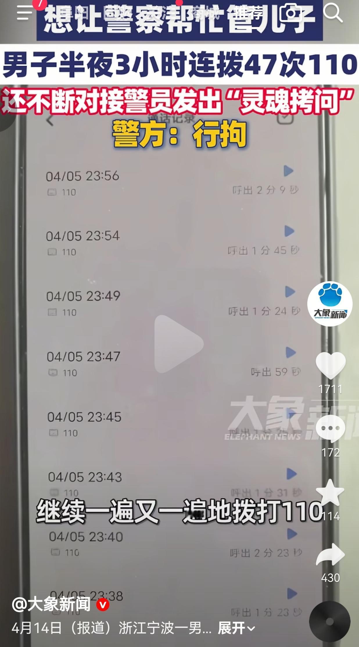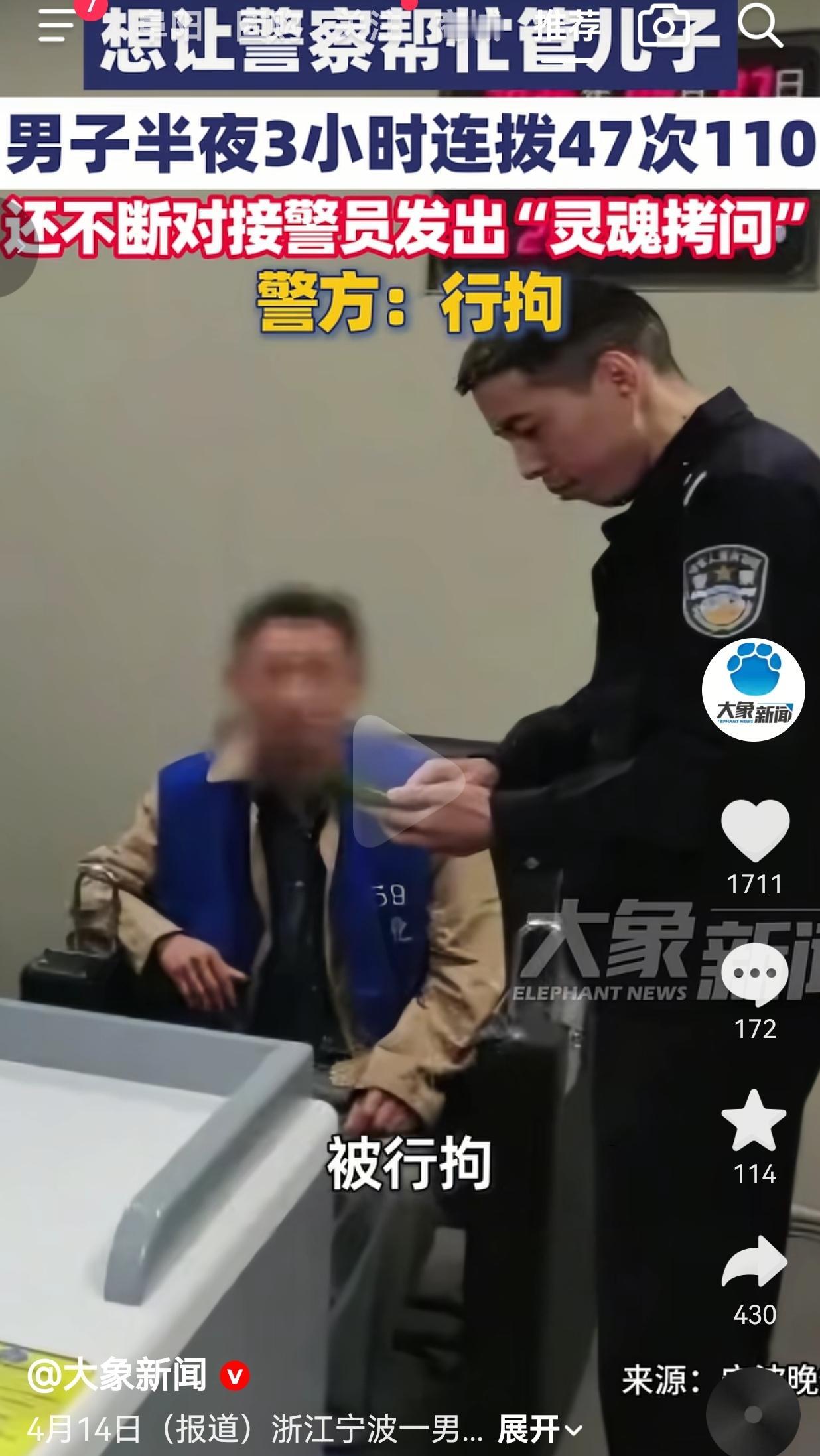 浙江宁波男子3小时狂拨47次110逼警察管儿子,最终被行拘7天。